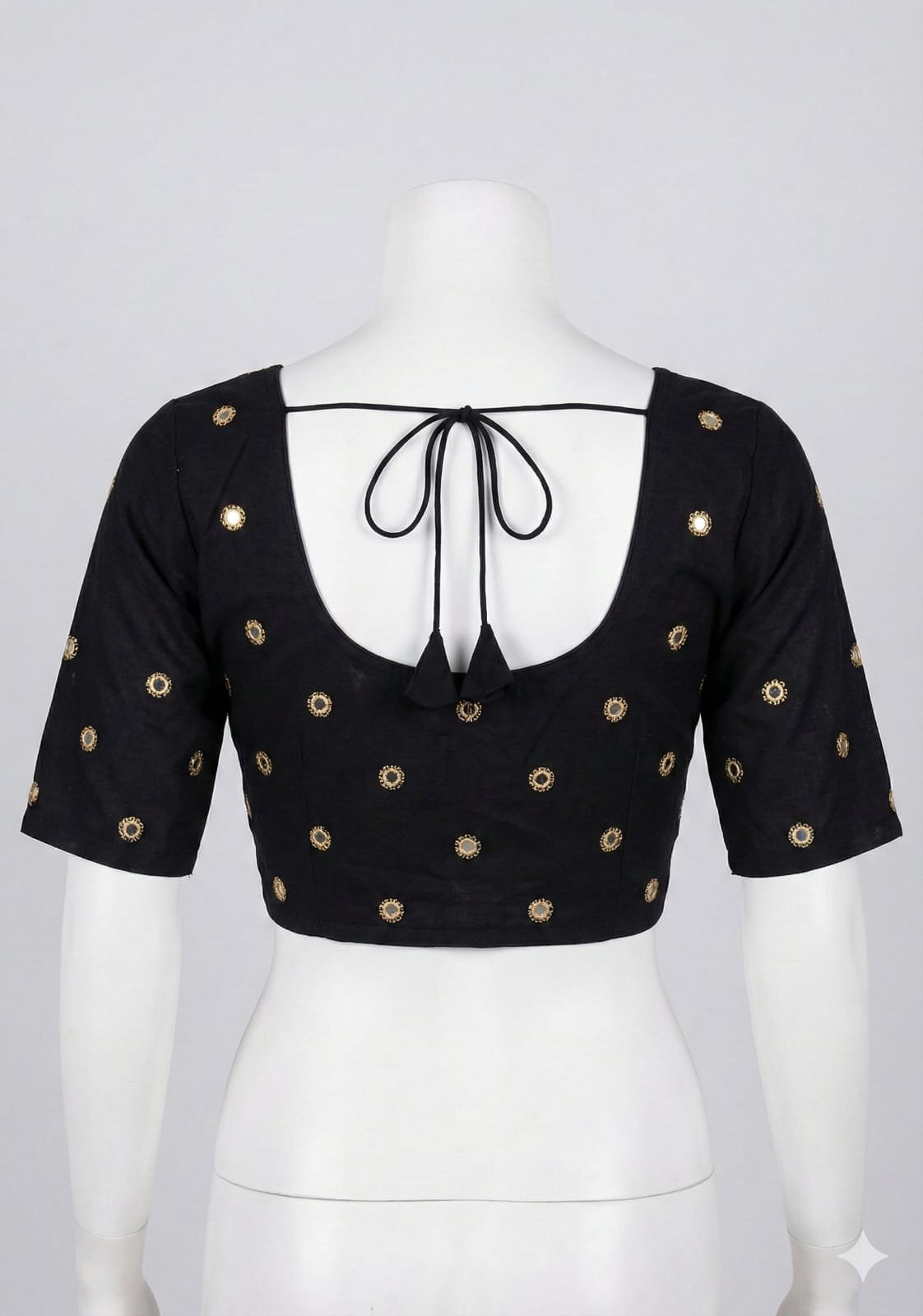 Black round neck blouse with deep round back.