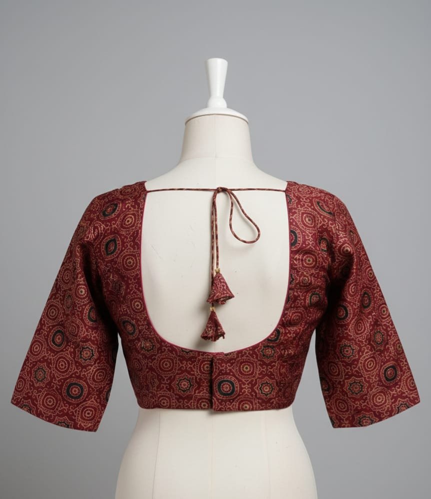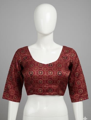 Crafted in rich gazi silk, this blouse brings together timeless elegance and everyday comfort. The soft sheen of the fabric and the ajrakh hand block print enhances its classic appeal, while the flattering U-neckline beautifully frames the silhouette.