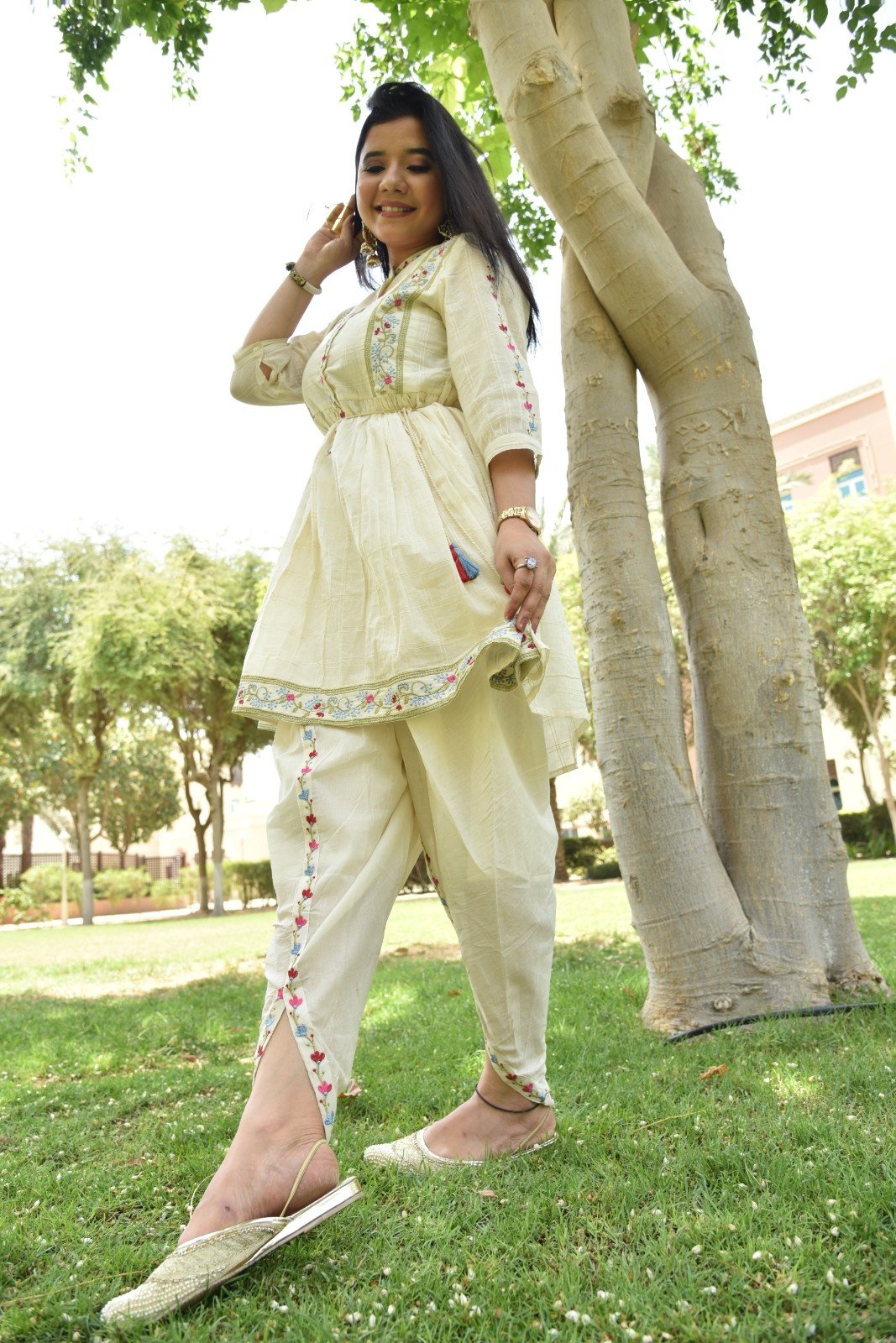 It is a set of knee length A line kurta and tulip dhoti pants with fancy belt.