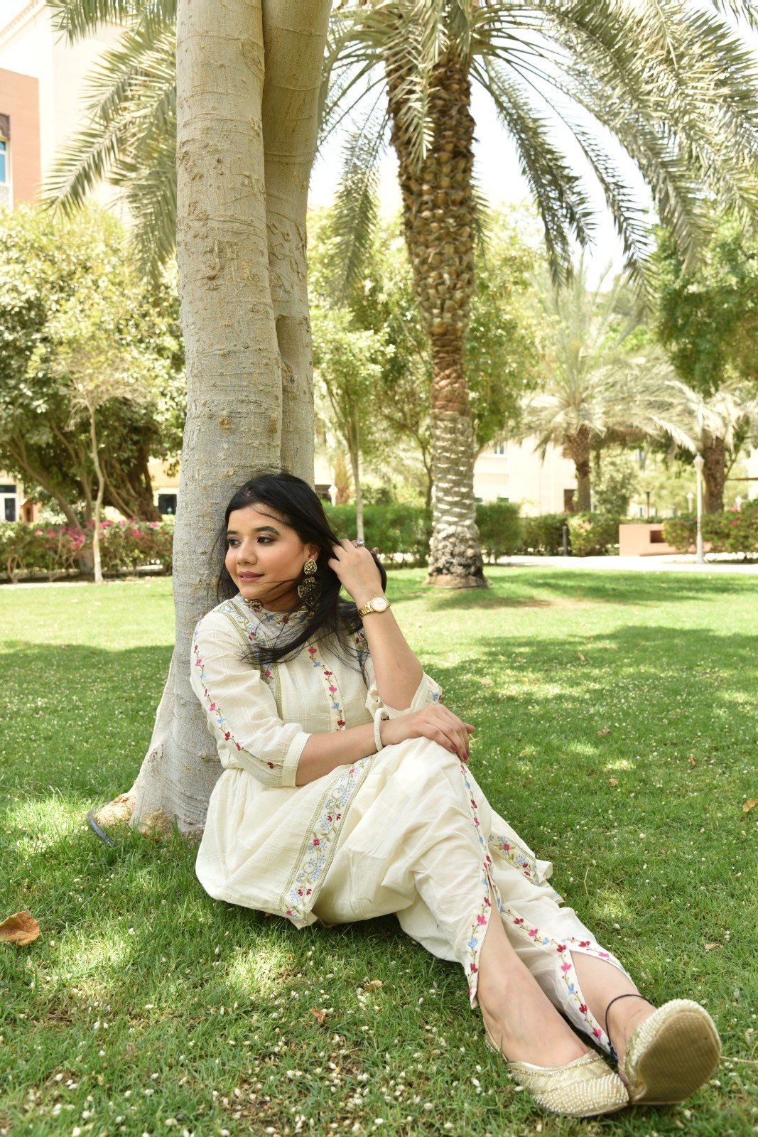 The tulip dhoti pant has embroidery detail on the dhoti flap.