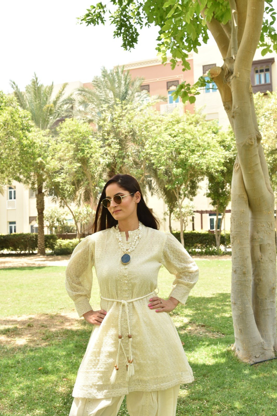 The chinese collar kurta is set in soft net fabric with sequin and button detials for and elegant look with braid detail belt.