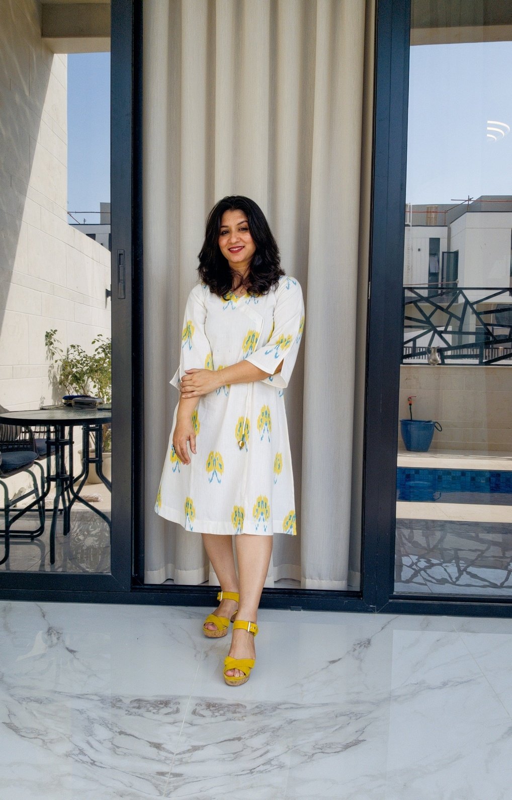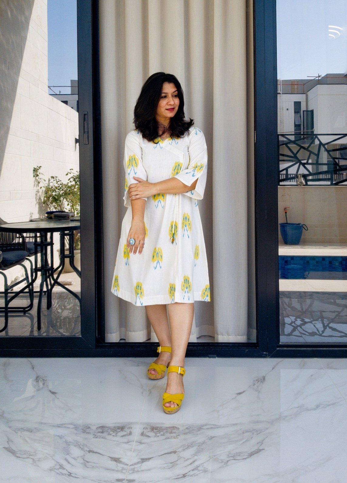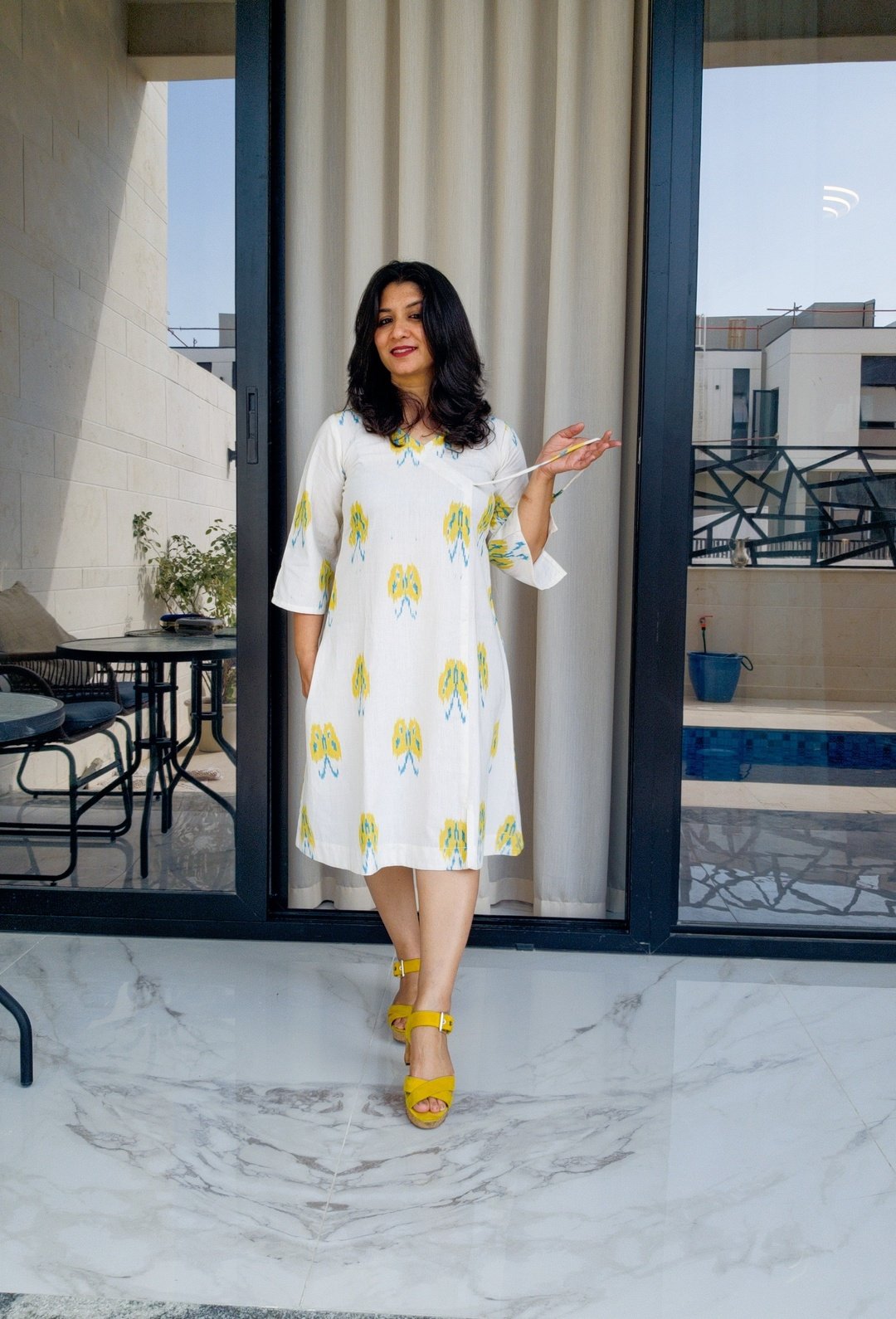 t’s an ikat dress with front slit on the sleeves for drama that speaks comfort and style, offering a chic solution for any occasion.