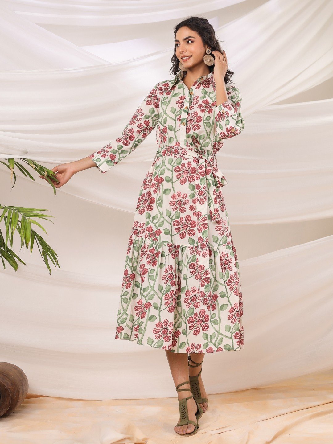 Elegant White green batik floral midi dress featuring a collar, belted waist, and ruffled skirt. Ideal for any event in the UAE. Crafted for comfort and chic.