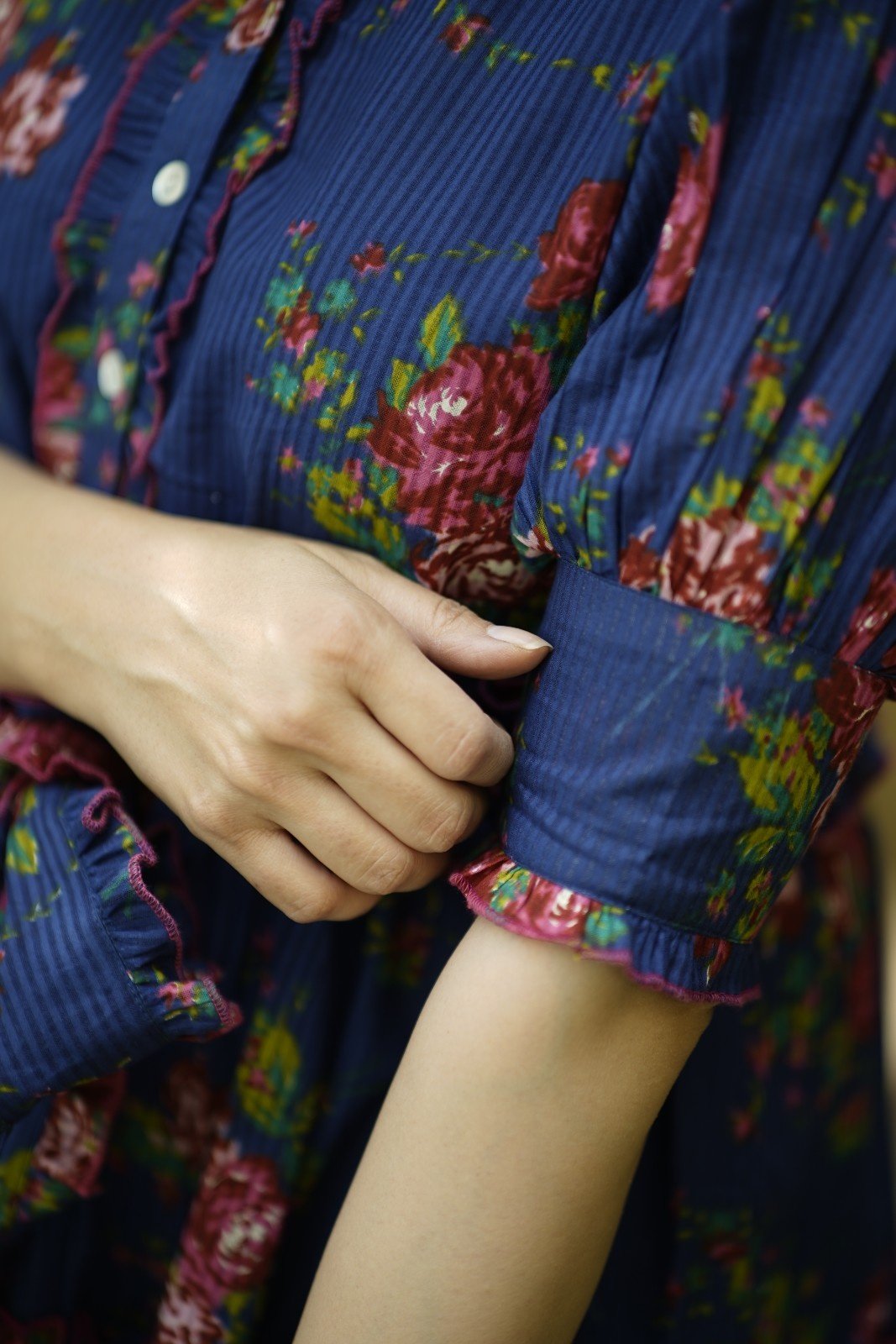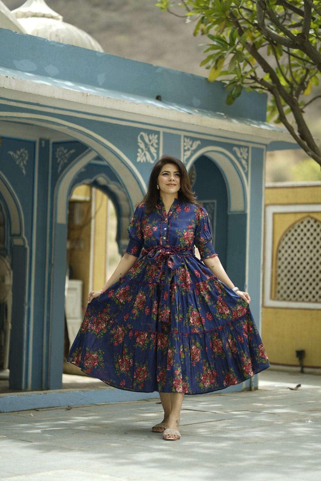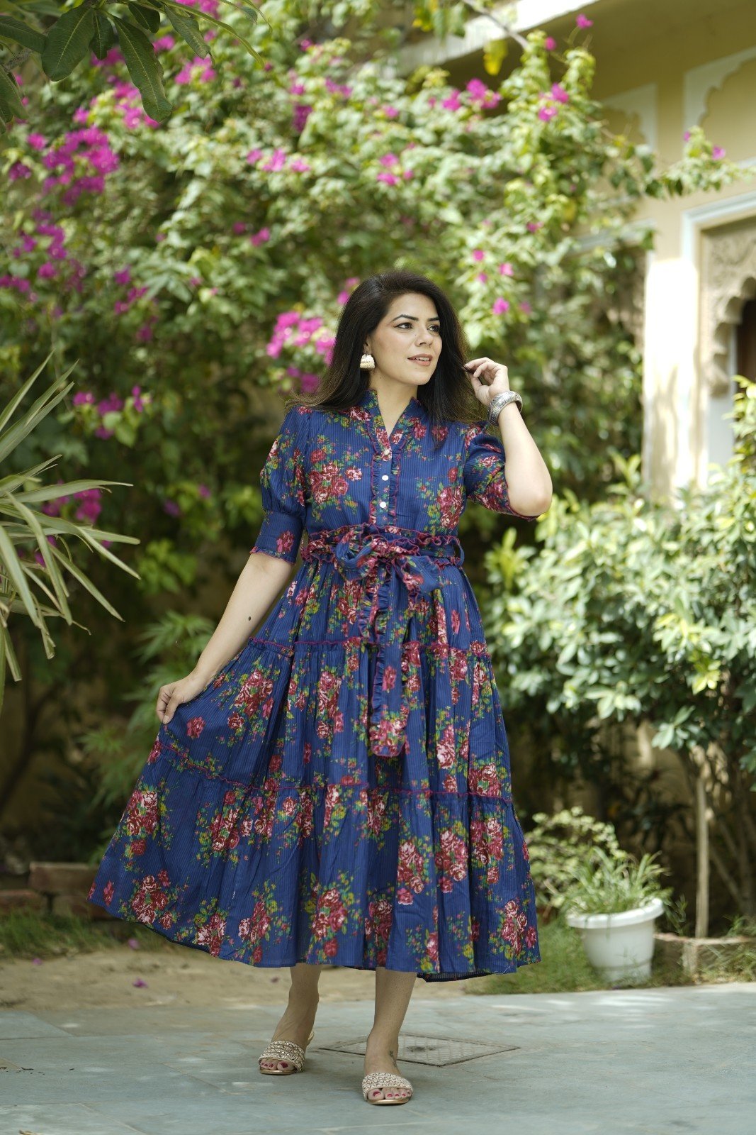 Experience the perfect marriage of comfort and classic elegance with our Floral Whisper Cotton Midi Dress. Crafted from the finest, softest cotton, this dress is designed to keep you cool and stylish throughout the warmer seasons. The rich royal blue base is adorned with a timeless floral pattern, making it a versatile staple for any occasion.