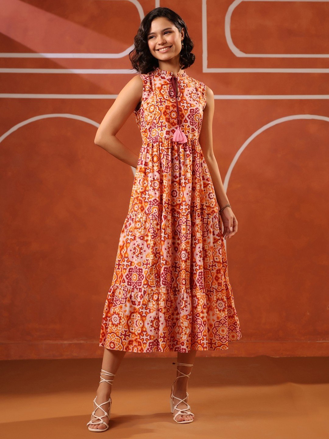 Step into sunshine with the Seville Tiered Maxi Dress. This show-stopping piece is crafted from a light, breathable fabric, making it your ideal choice for warm-weather dressing. The stunning medallion-inspired print blends rich orange, deep fuchsia, and soft pink hues, ensuring you turn heads wherever you go.