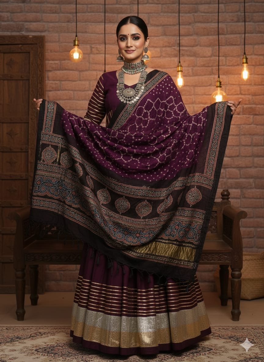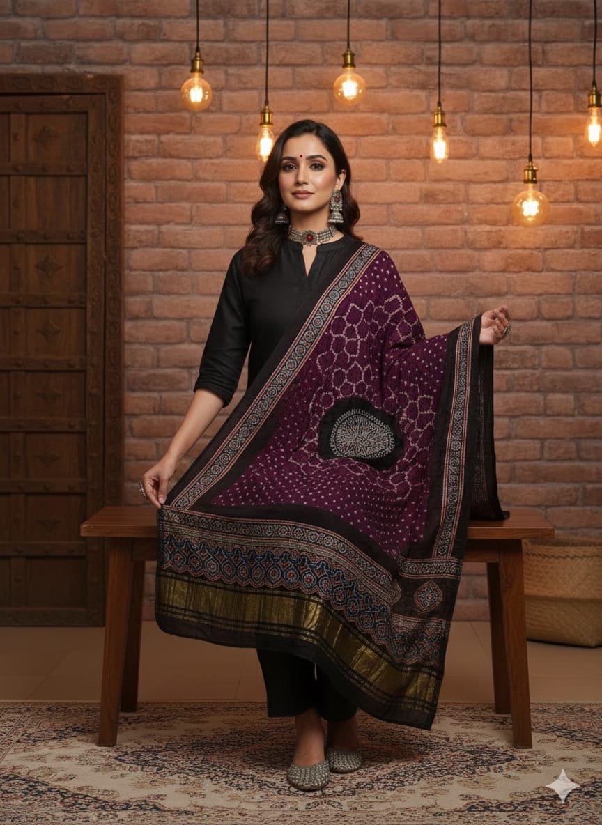 This exquisite purple dupatta is a labor of love, featuring traditional Hand-Block Printed Ajrakh motifs seamlessly blended with the intricate artistry of Hand-Woven( hand knotted) Bandhej.