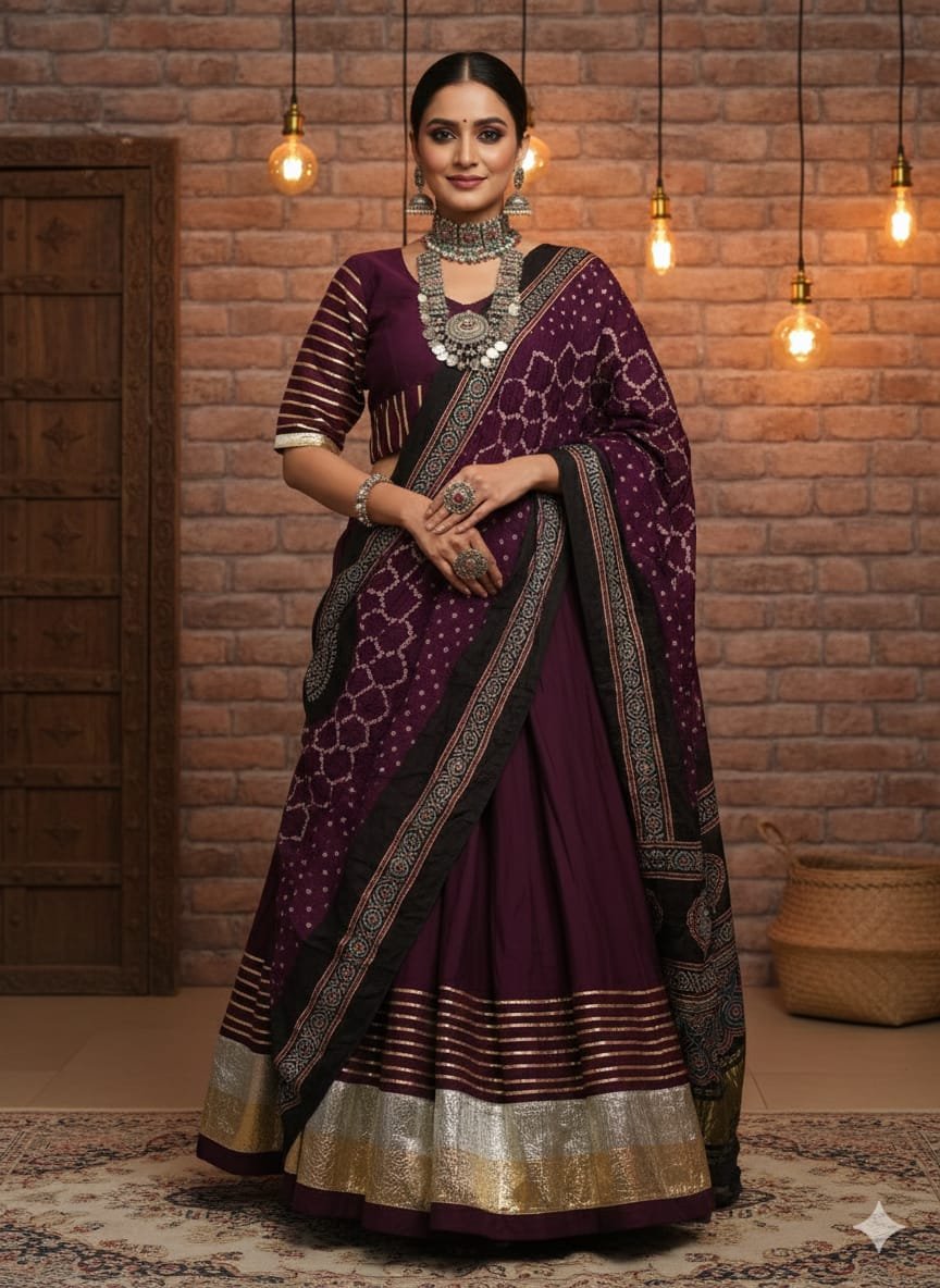 This exquisite purple dupatta is a labor of love, featuring traditional Hand-Block Printed Ajrakh motifs seamlessly blended with the intricate artistry of Hand-Woven( hand knotted) Bandhej.