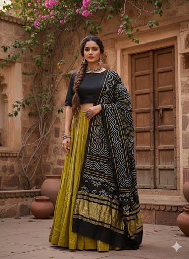 Finished with a subtle tissue daman, the dupatta brings a hint of sheen and sophistication, perfectly balancing the earthy charm of Bandhej with a polished, festive touch. A versatile accessory that complements both traditional and contemporary silhouettes.
