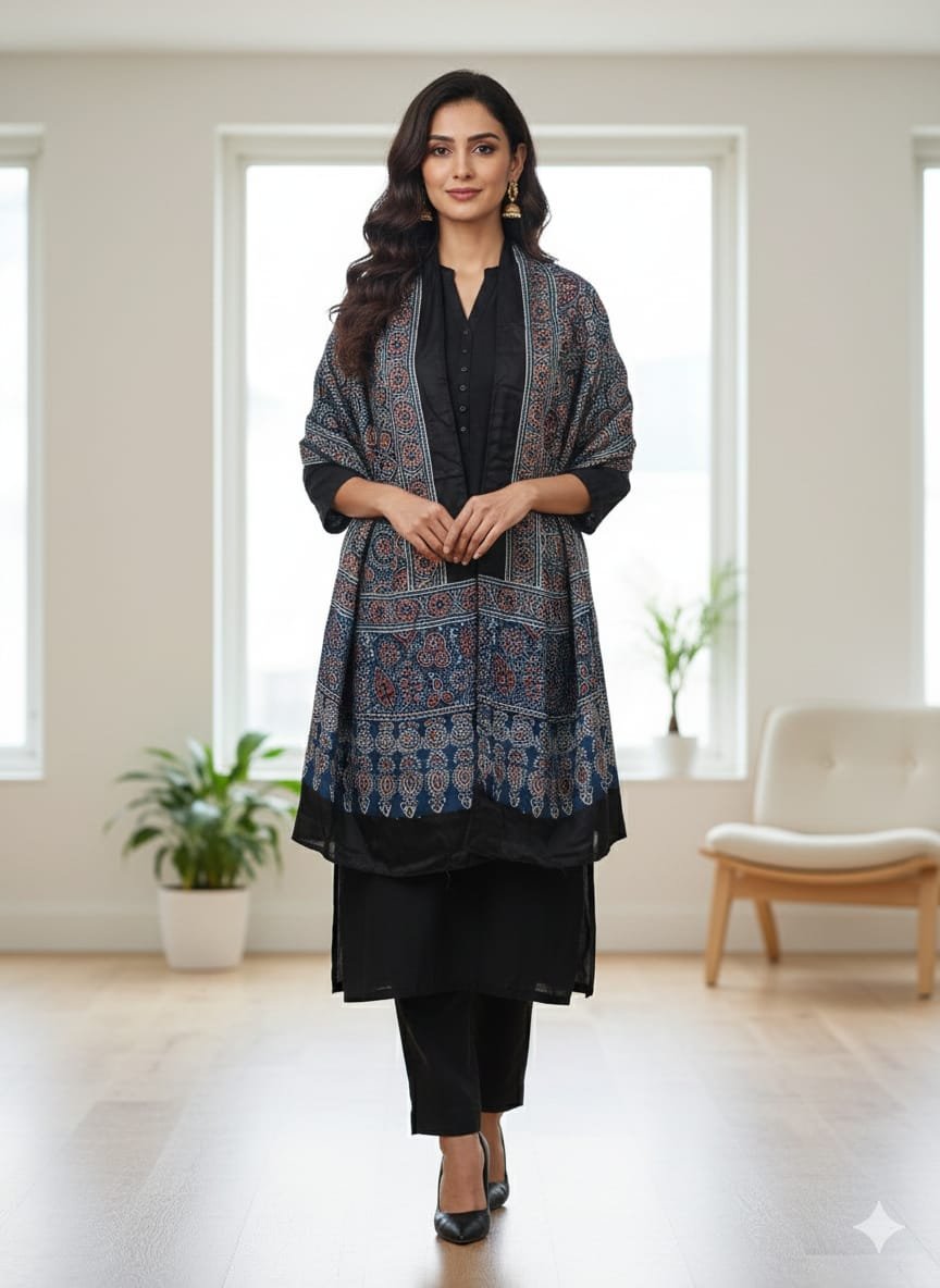 Crafted in luxurious pure modal silk, this Ajrakh stole celebrates timeless Ajrakh handblock print crafted with pure vegetable dyes for an earthy, authentic finish. The intricate geometric and floral Ajrakh motifs are rendered in deep, earthy tones, reflecting the heritage craftsmanship of natural dyes and precision printing.