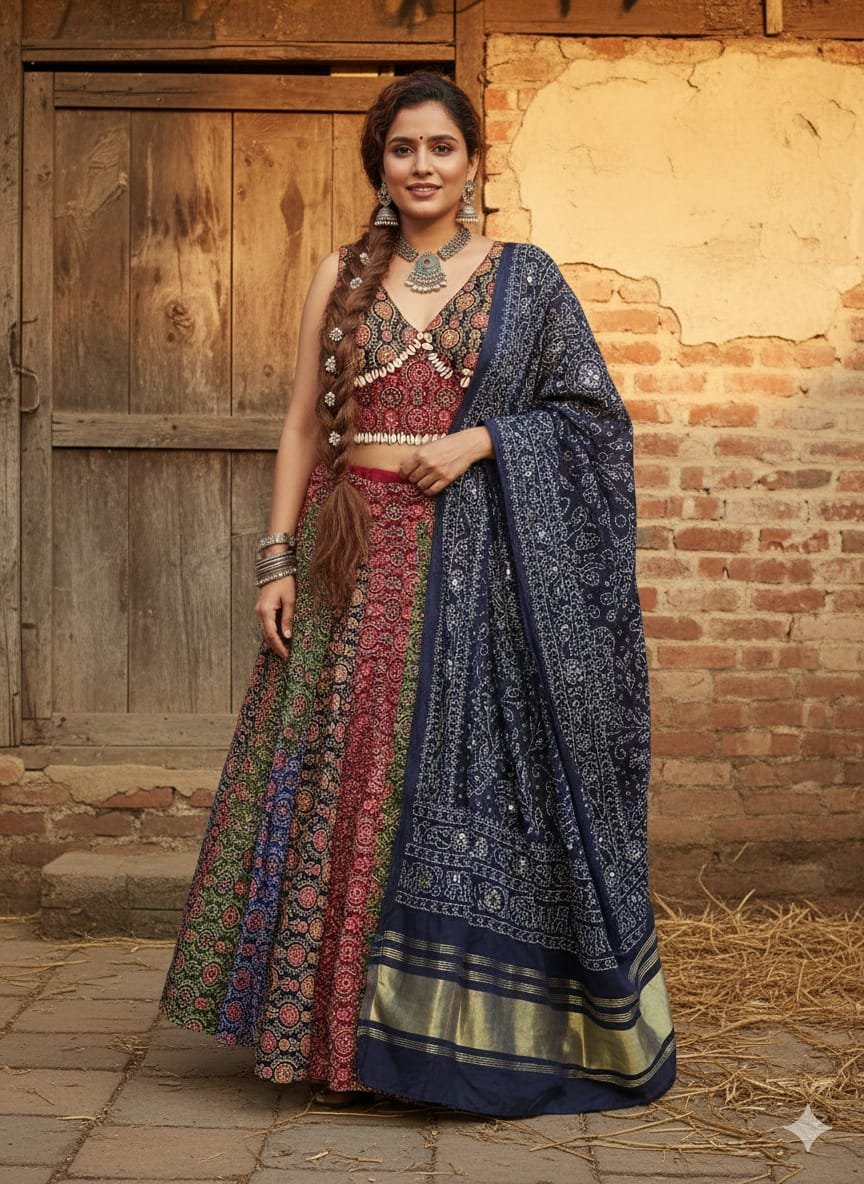 A pure cotton dupatta featuring traditional Bandhej tie-dye patterns, accented with sparkling mirrorwork and a shimmering tissue daman (border). Perfect for a high-contrast, festive look.