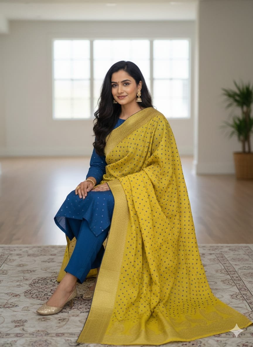 Elevate your ethnic wardrobe with this exquisite Modal Silk dupatta, a perfect blend of comfort and timeless craftsmanship. Crafted in luxuriously soft modal silk, this dupatta features a rich Banarasi woven border that adds a regal touch. Delicate, small hand-tied Bandhej (bandhani) motifs are thoughtfully scattered across the body, lending subtle texture and traditional charm.