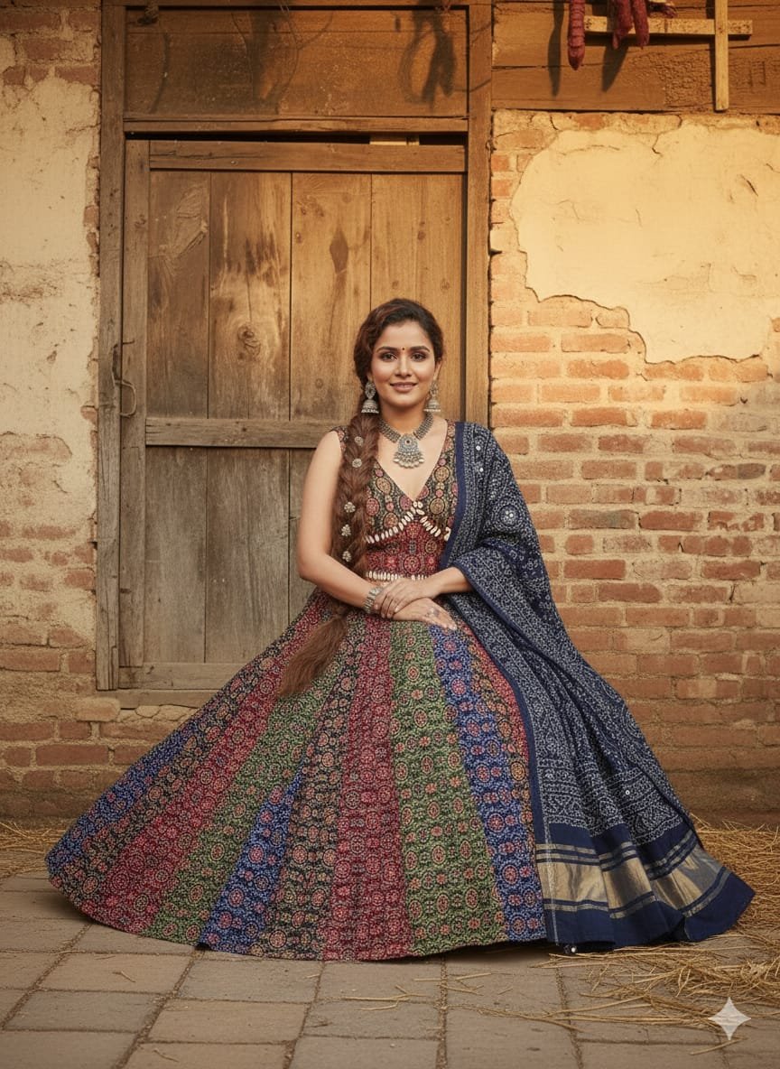 The Lehanga: A voluminous 20-kali skirt crafted from premium cotton. Each panel (kali) features a unique multi-color Ajrakh print, creating a stunning kaleidoscope of earthy tones and traditional motifs that come alive with every step.