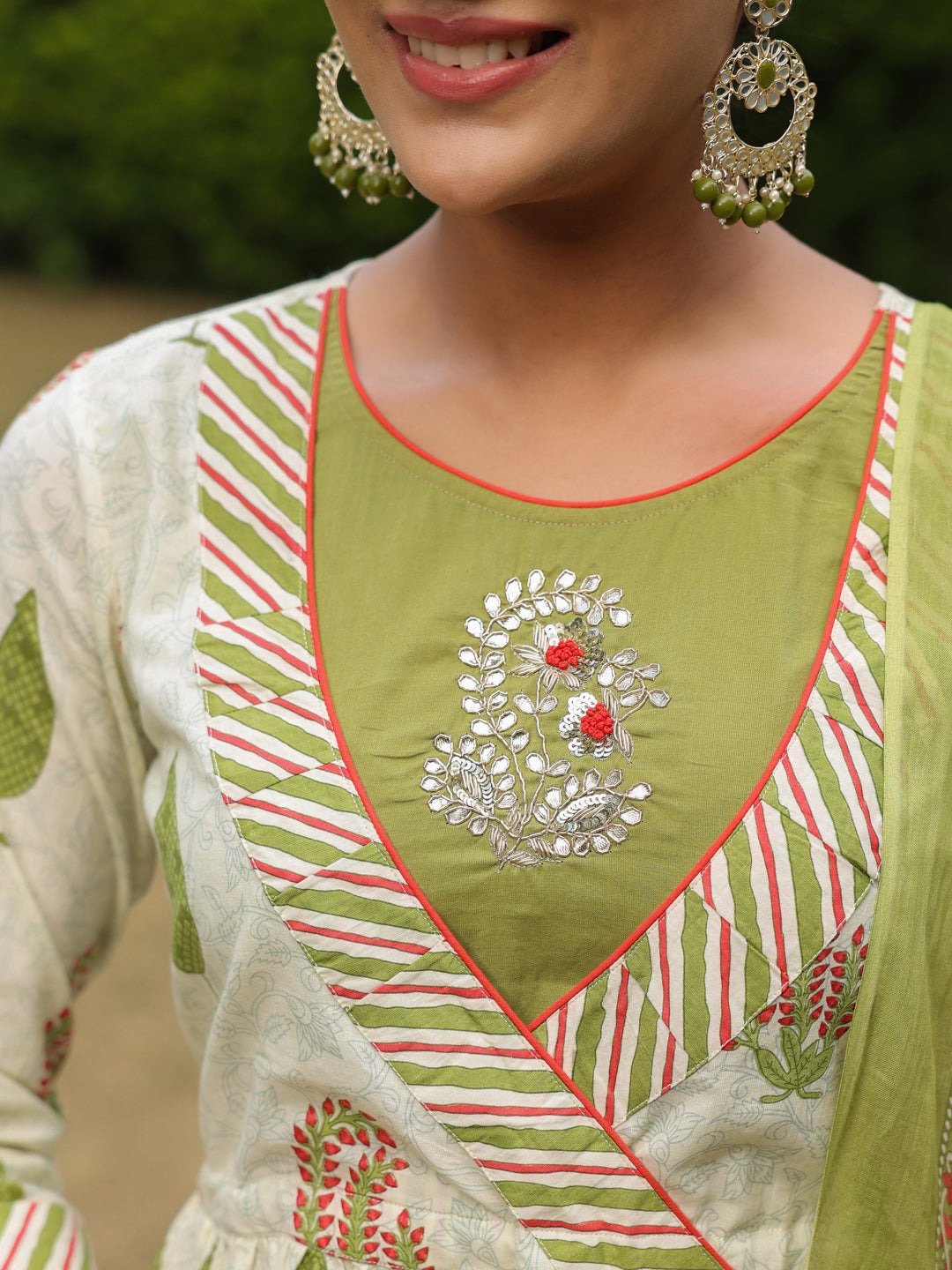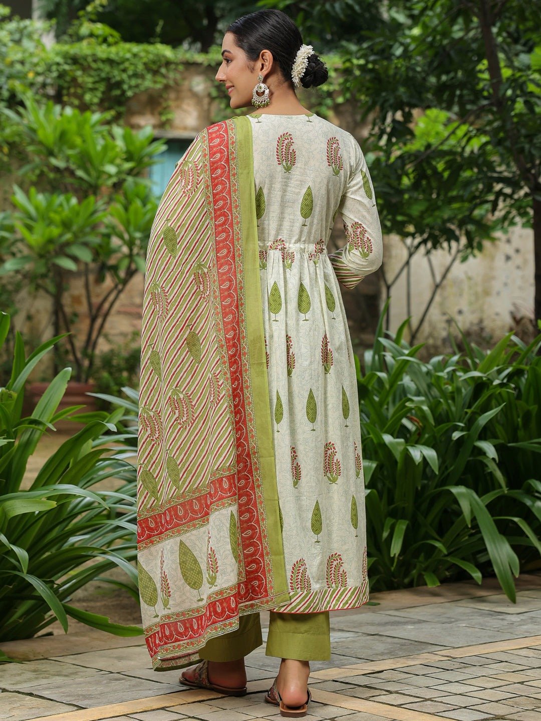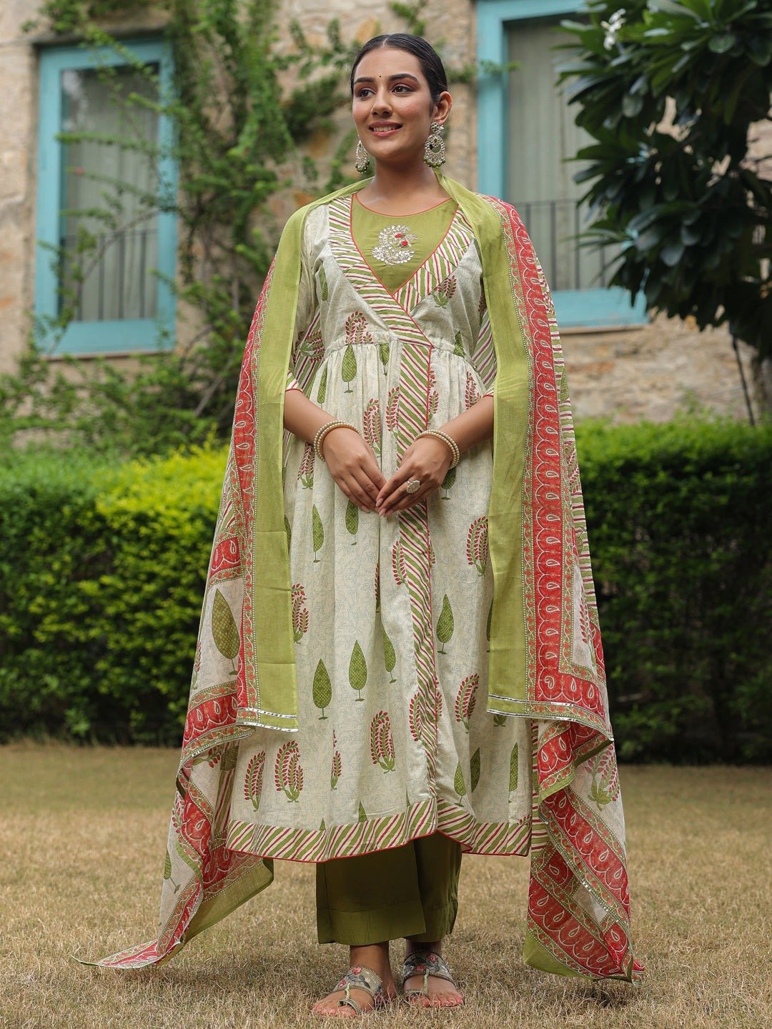Paired with the kurta are comfortable olive‑green straight pants that balance the look with subtle sophistication. The matching dupatta ties the entire outfit together, showcasing complementary prints and a striking red border that adds just the right amount of vibrance.