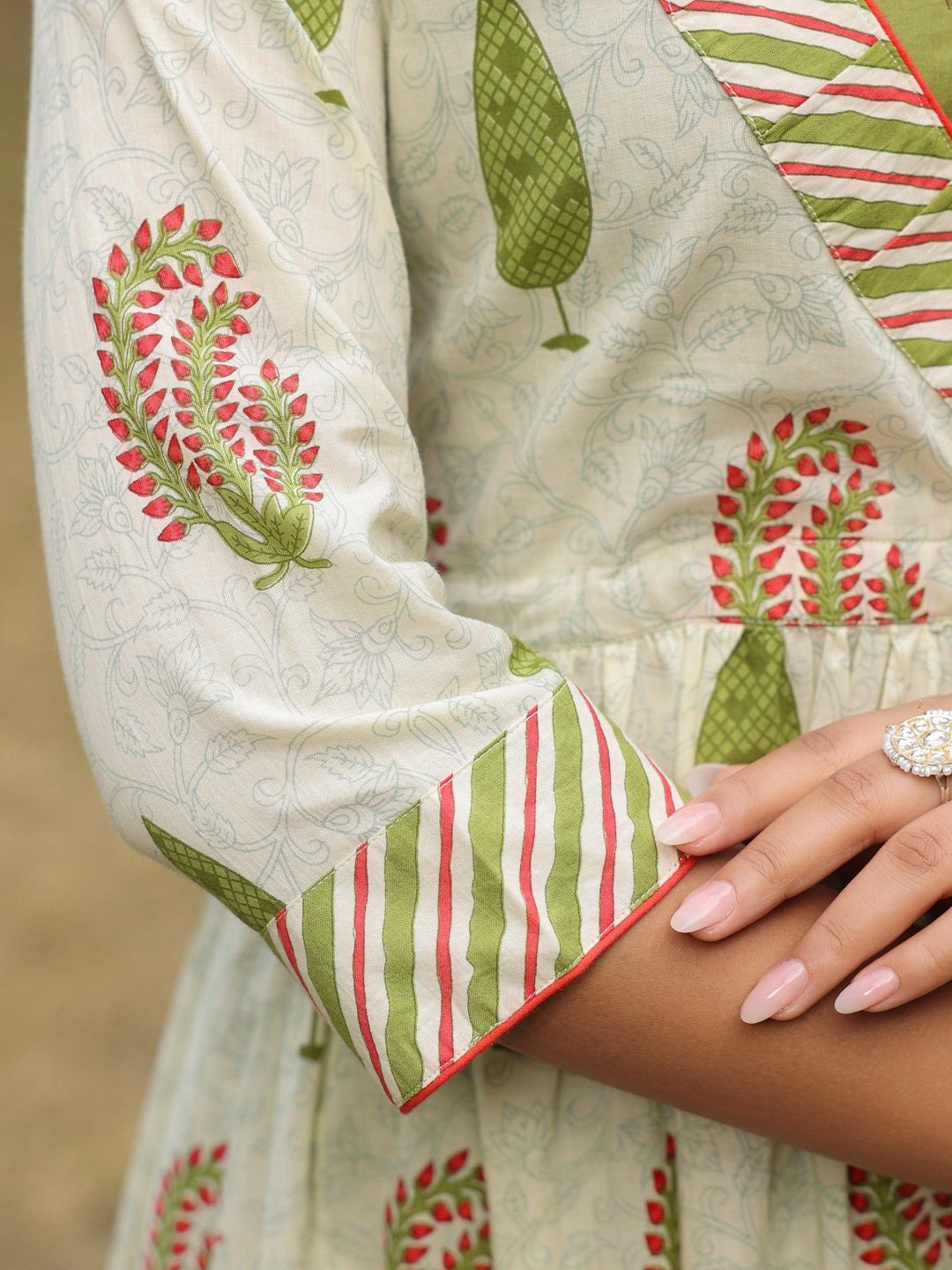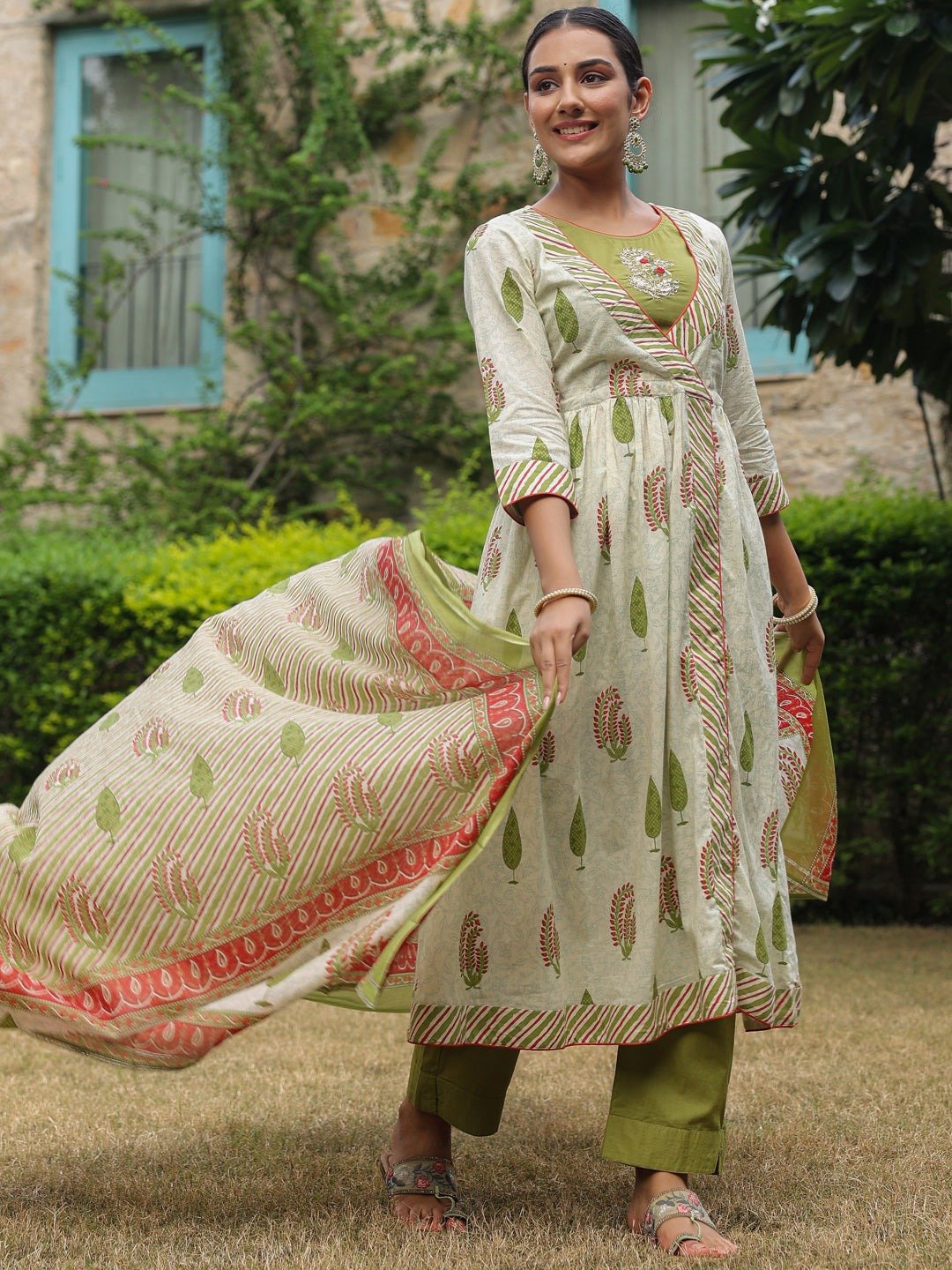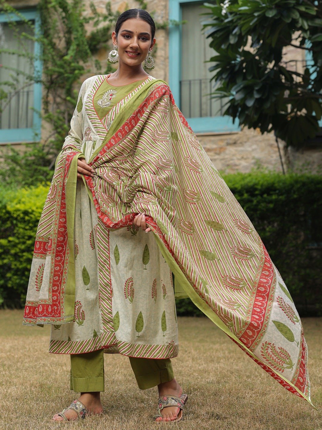 Step into the charm of Rajasthan with this beautifully crafted Jaipur 3‑piece set, designed for women who appreciate tradition with a modern touch. The ensemble features a soft cream kurta adorned with hand‑inspired block‑print motifs in earthy greens and deep reds—an ode to Jaipur’s iconic textile artistry. Its relaxed silhouette offers effortless elegance, making it perfect for festive gatherings, daytime outings, or cultural celebrations.