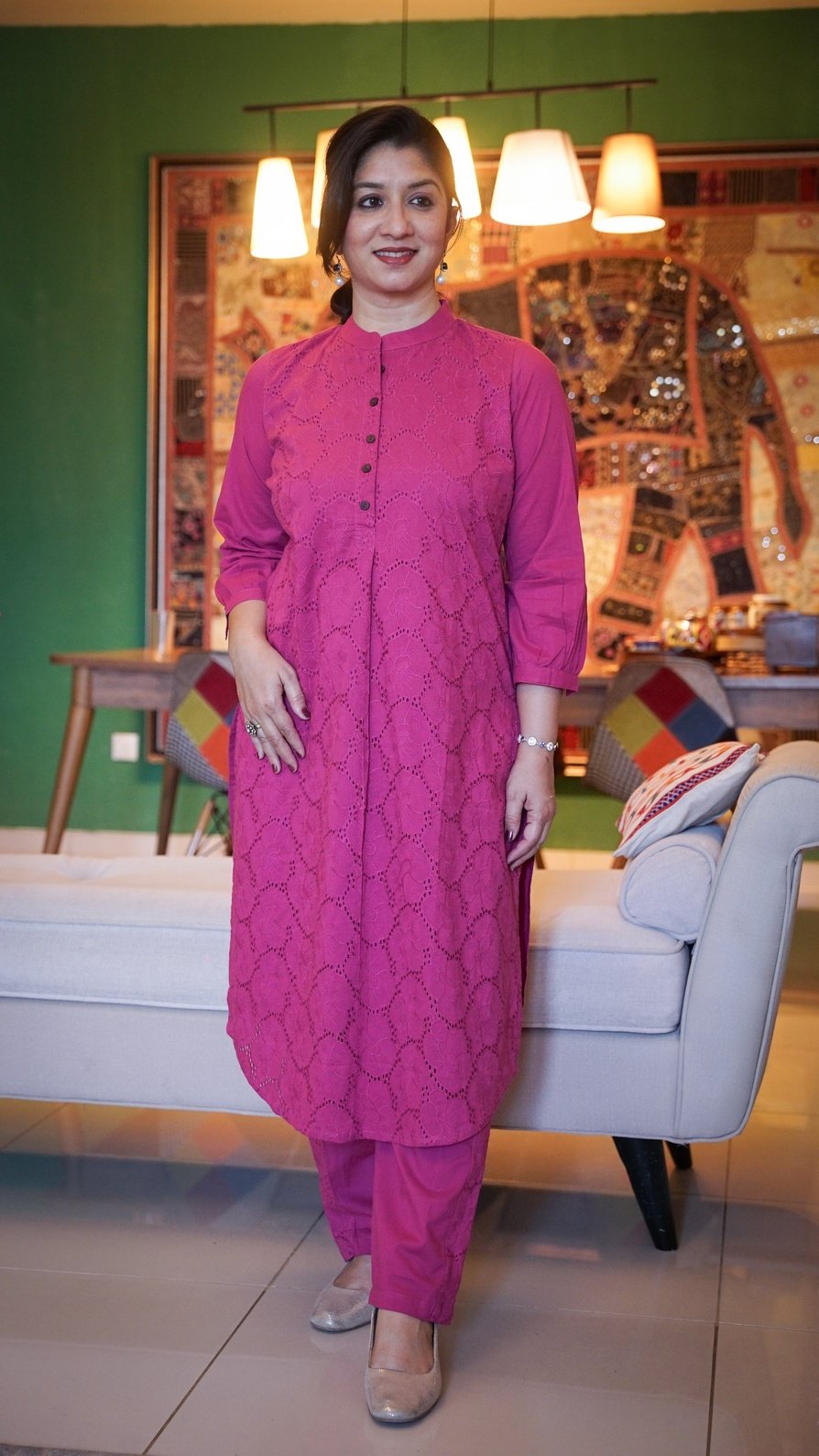 Vibrant Mauve Pink color in schiffli work cotton kurta and pants set.