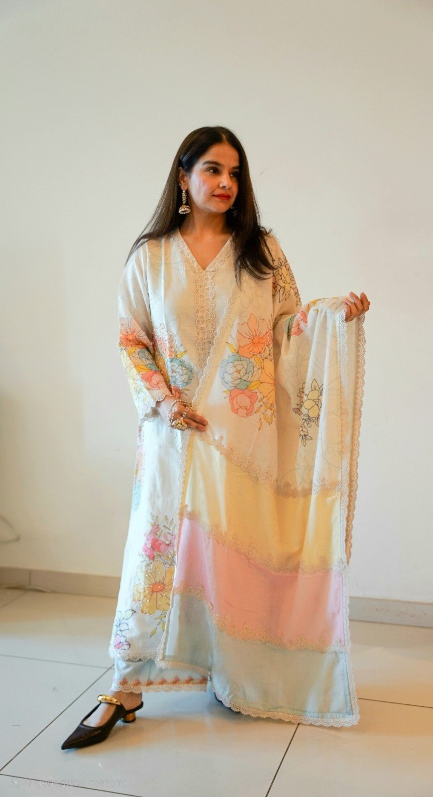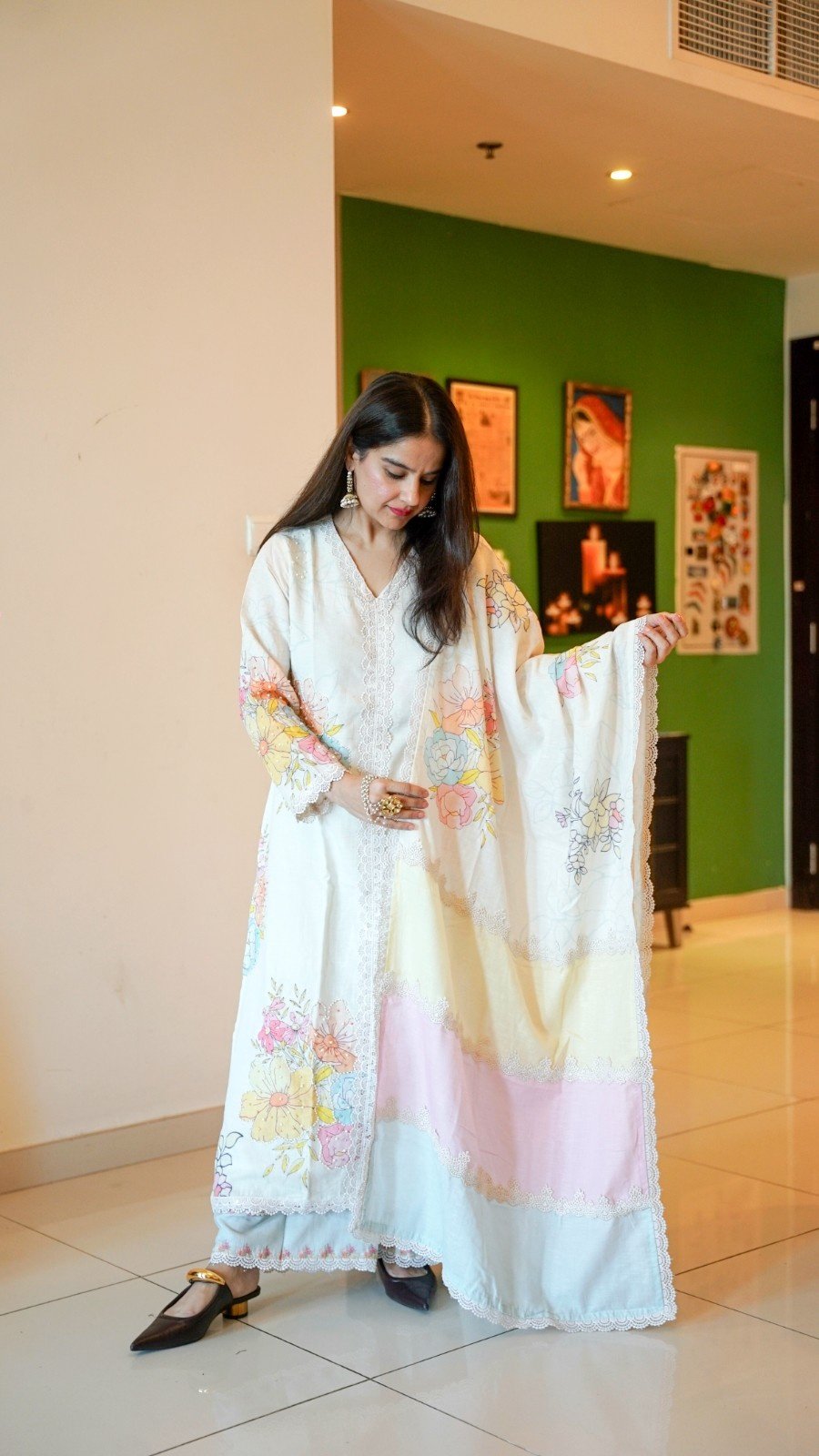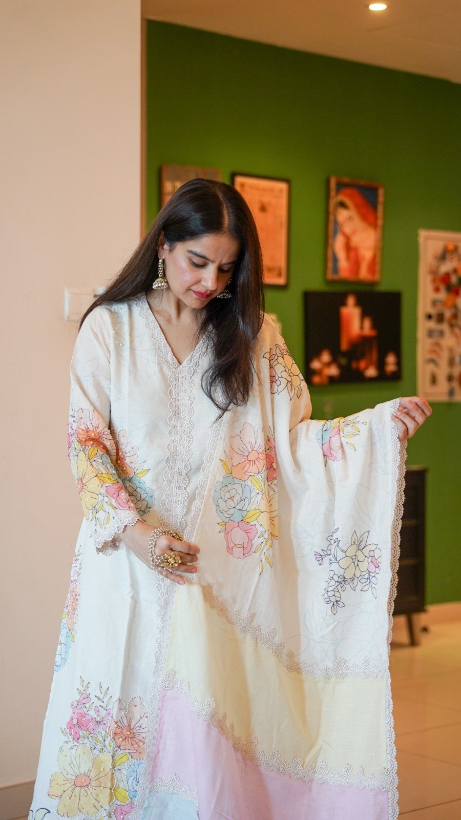 Elevate your warm-weather wardrobe with our stunning cream-colored linen blend cotton salwar suit, adorned with delicate pastel print motifs. This ensemble is a perfect blend of elegance and comfort, ideal for upcoming festivities or a stylish daytime look.