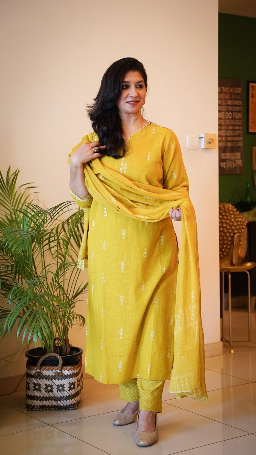 Soft linen-cotton kurta and pants with self-weave paired with mulmul dupatta