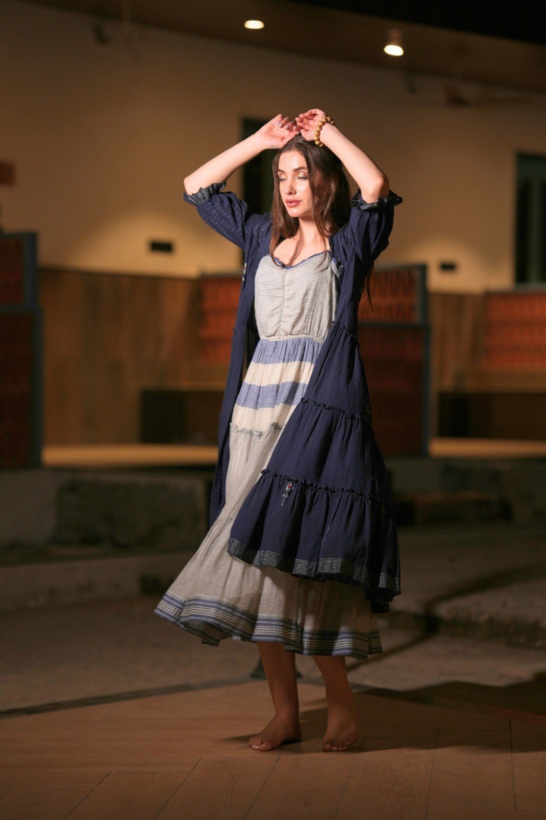 Elevate your style with our stunning soft gamcha cotton layered dress, featuring an enchanting combination of blue and grey hues. The inner spaghetti dress boasts a pleated bust line and delicate frill details at the border, while the gorgeous midnight blue outer layer is woven with intricate blueish silver floral motifs and stripes. The dress is further accentuated with beautiful 3/4 frill sleeves, adding a touch of whimsy and elegance.