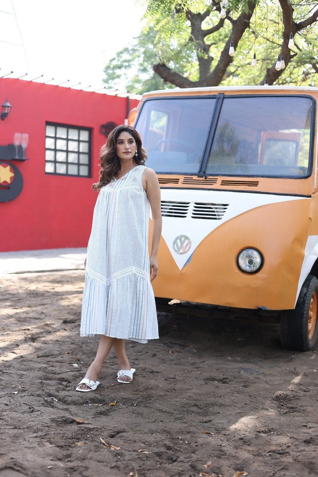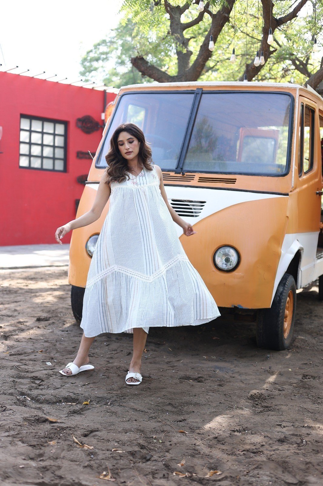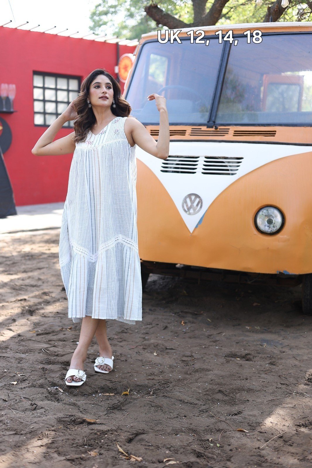 Step into comfort and style with our sleeveless pastel striped dress in soothing grey, brown, and blue hues. Crafted from premium handloom cotton fabric with a full-length lining, this dress features attachable sleeves for versatility. The neckline boasts intricate French knot embroidery and a stylish zigzag crochet lace pattern that adds a touch of whimsy to the hem.