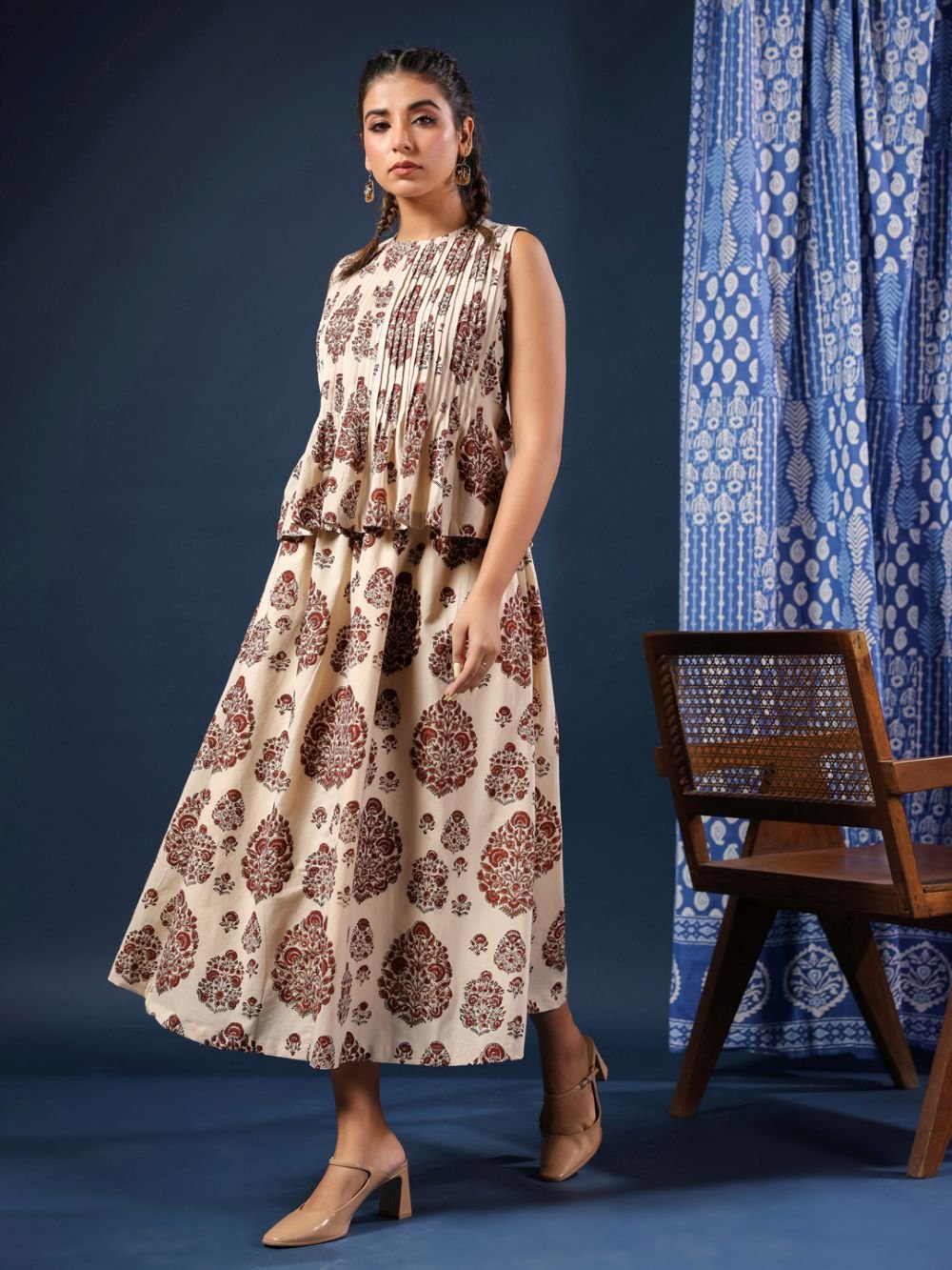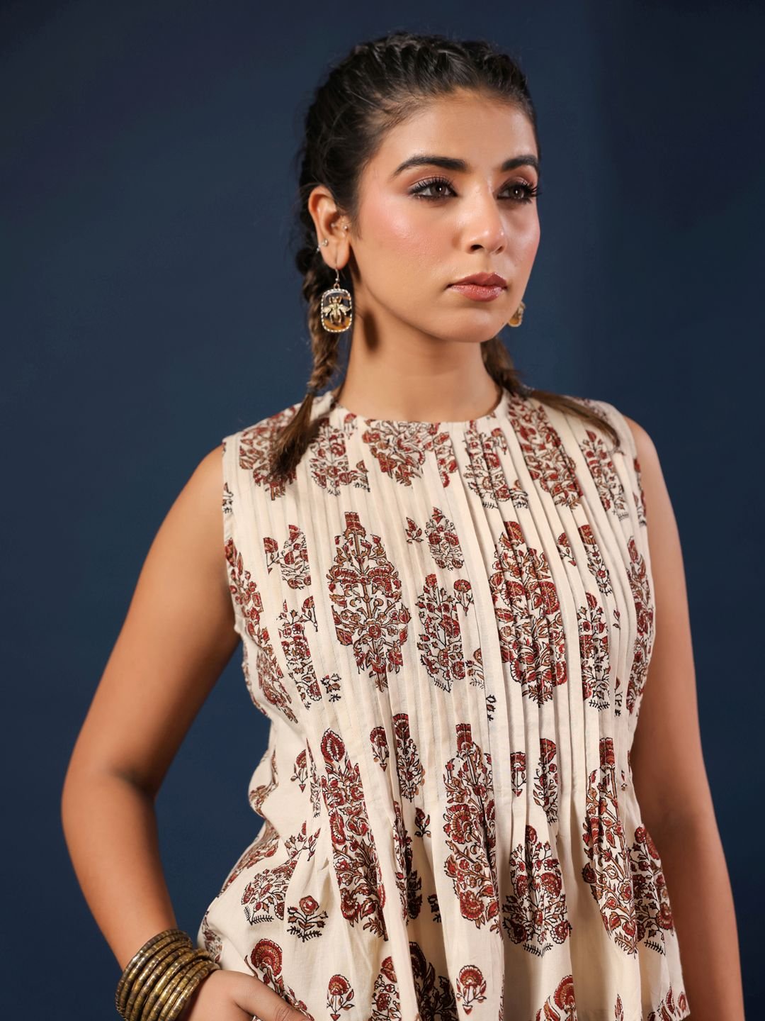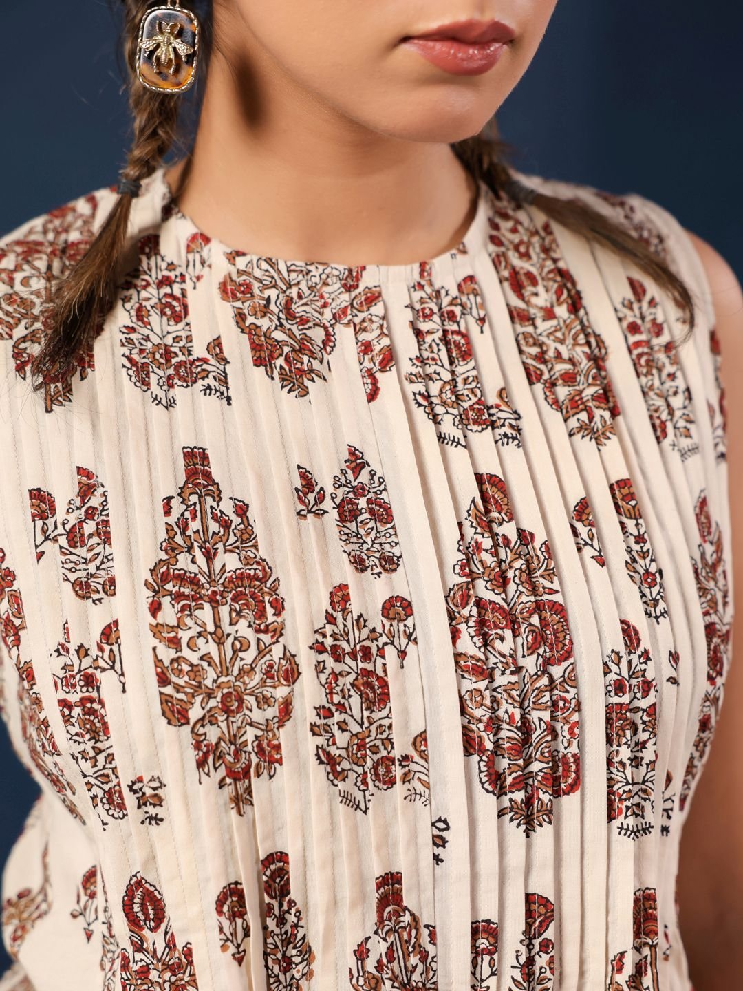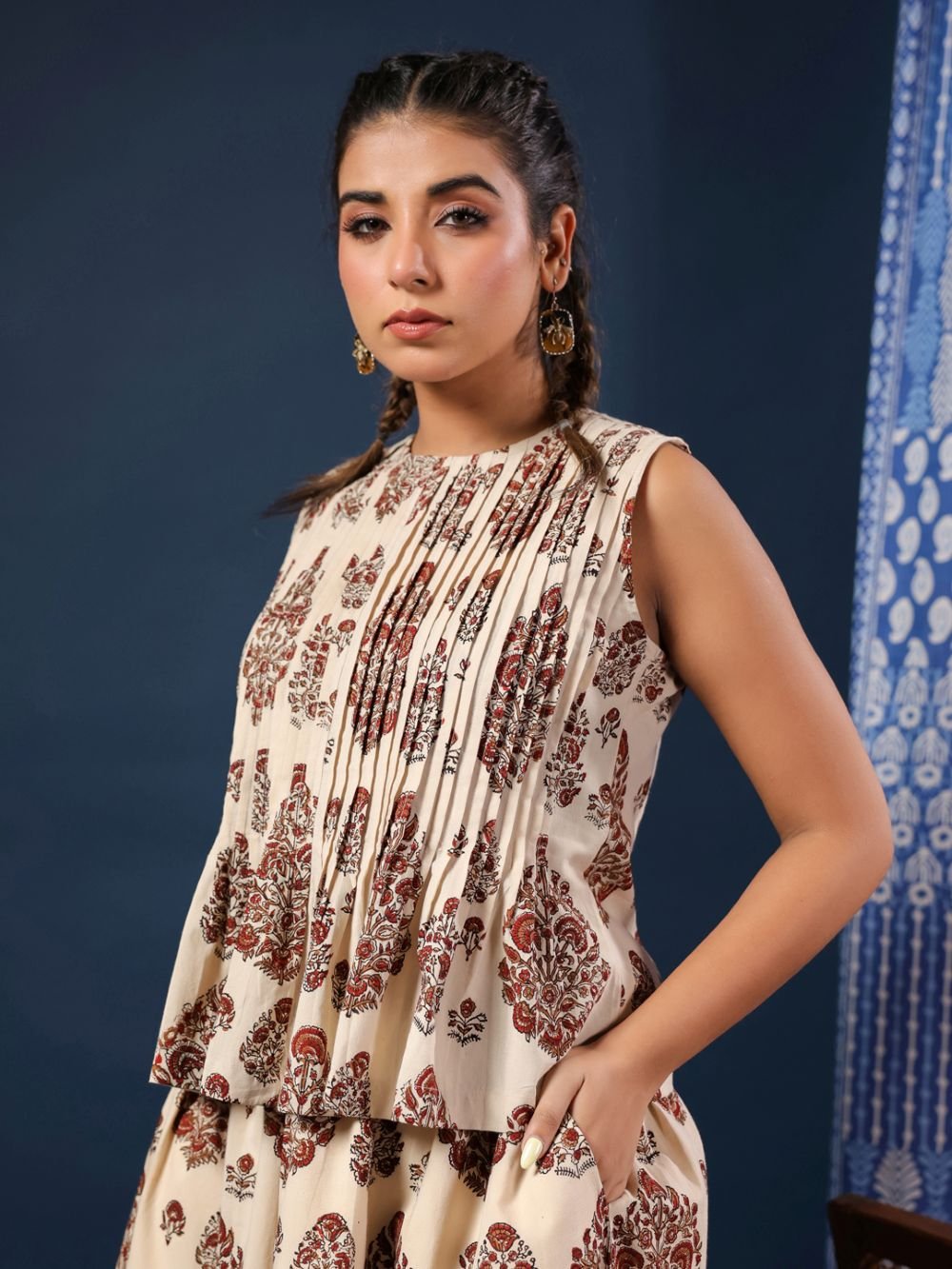 Adorned with delicate flower bunch motifs in traditional hand block print, each piece reflects the beauty of artisanal craftsmanship. The sleeveless top offers a relaxed yet flattering fit, making it perfect for warm days and easy styling.
