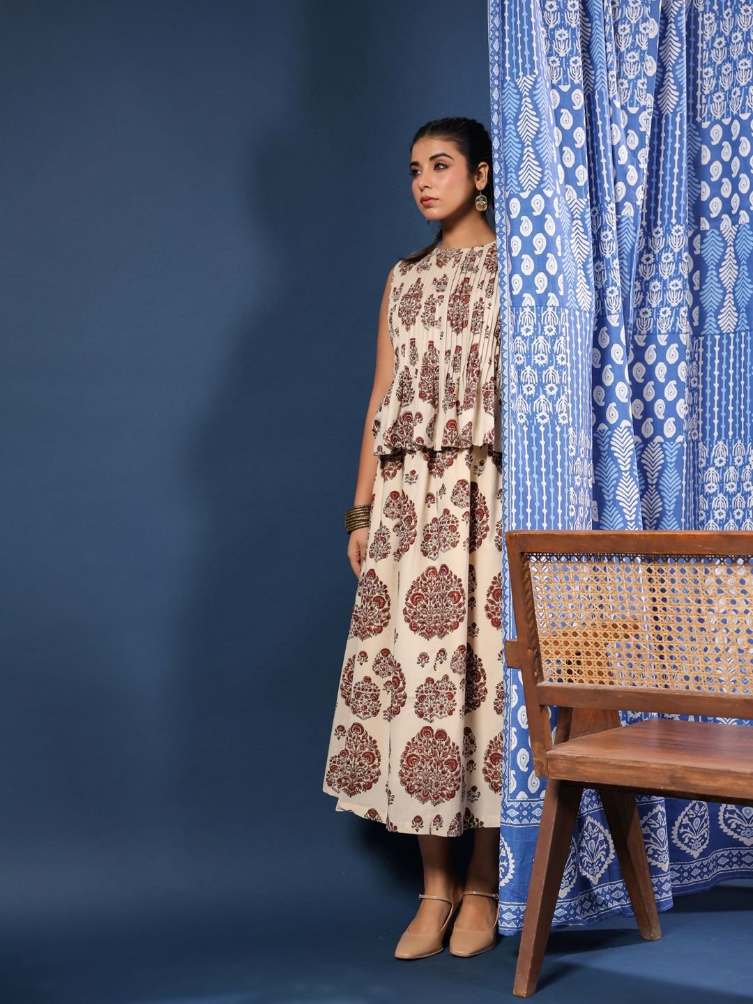 Paired with a graceful, flowy skirt, this set creates a balanced silhouette that feels both refined and comfortable. The lightweight Jaipuri cotton ensures all-day ease, whether you're heading to a brunch, a casual gathering, or a festive daytime event.