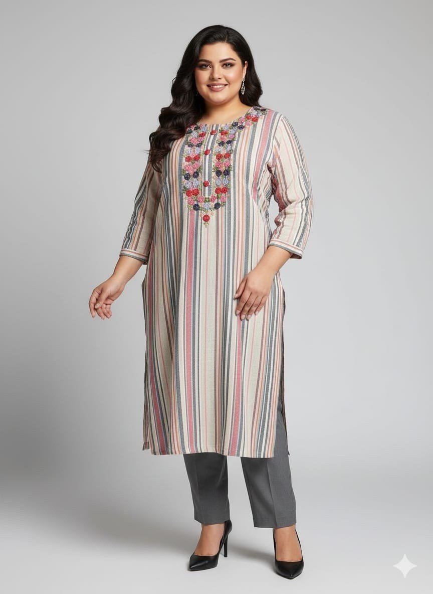 Striped handloom pastel kurti with floral embroidery on neckline