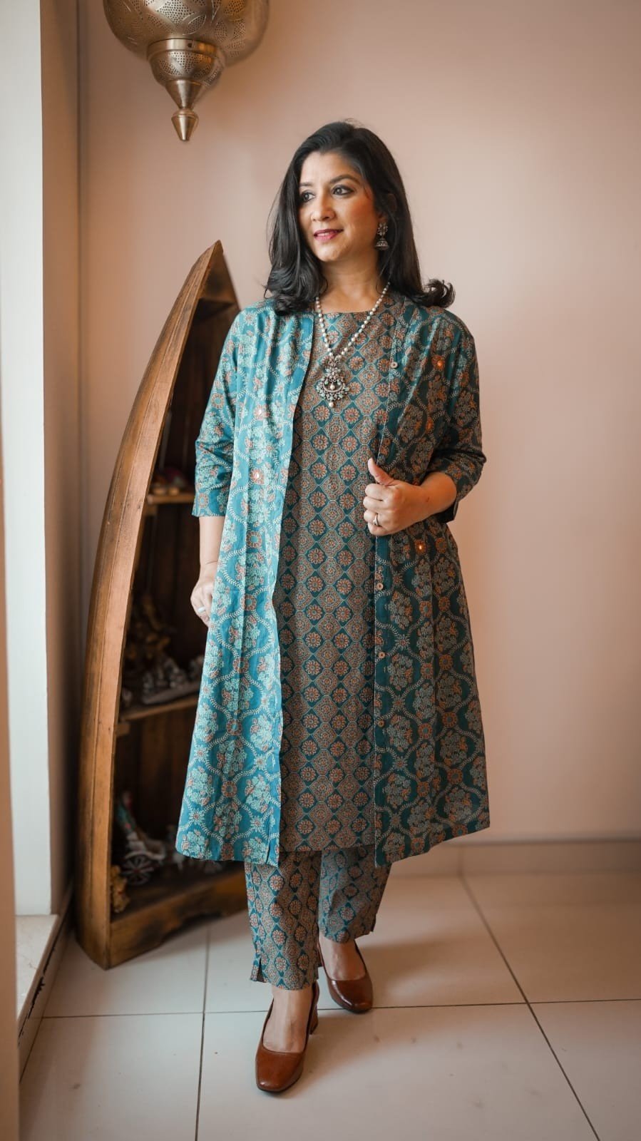 A three piece Cobalt blue tone cotton-printed set that lets you style it three ways: