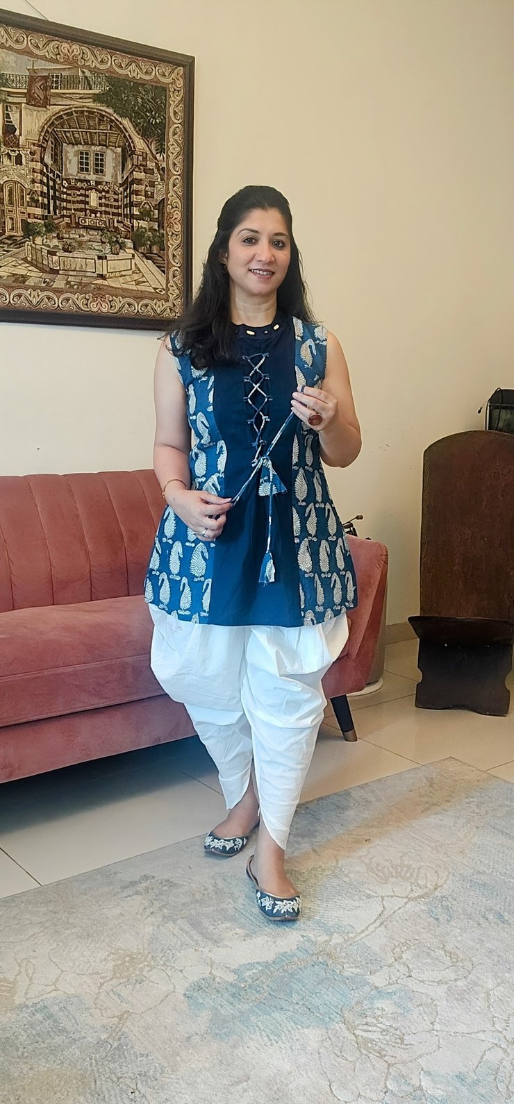 Half plain and half printed sleeveless Indigo kurti.