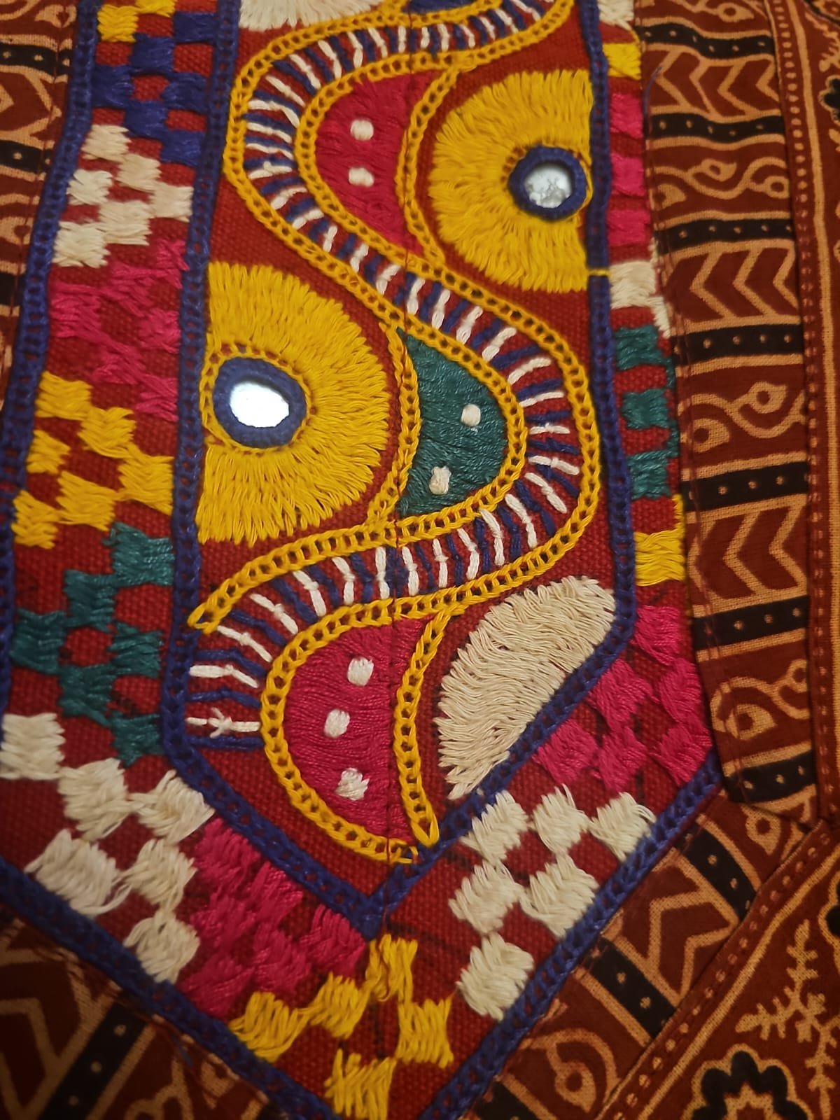 Multicolor kucthwork yoke with maroon piping and mirrorwork