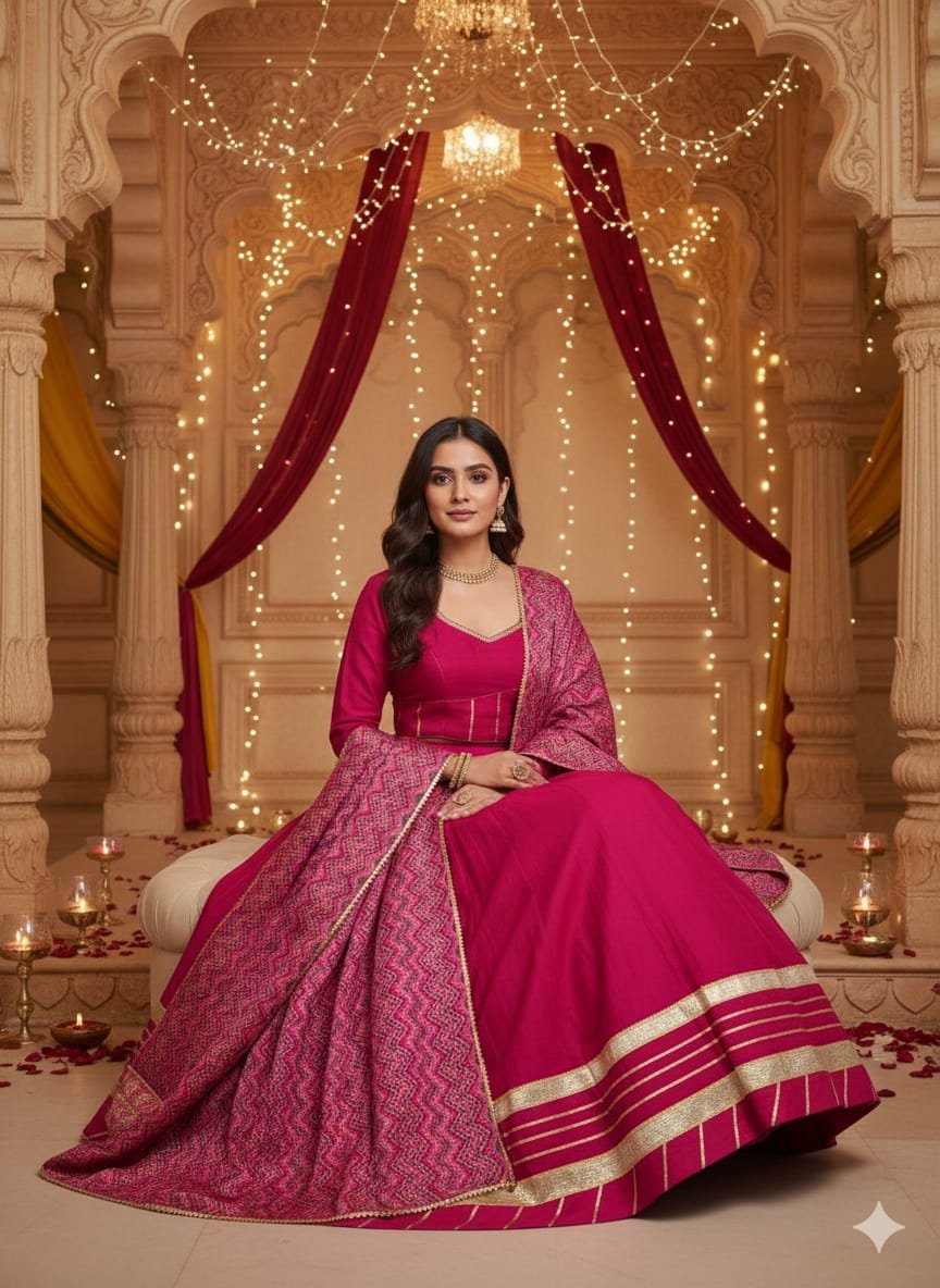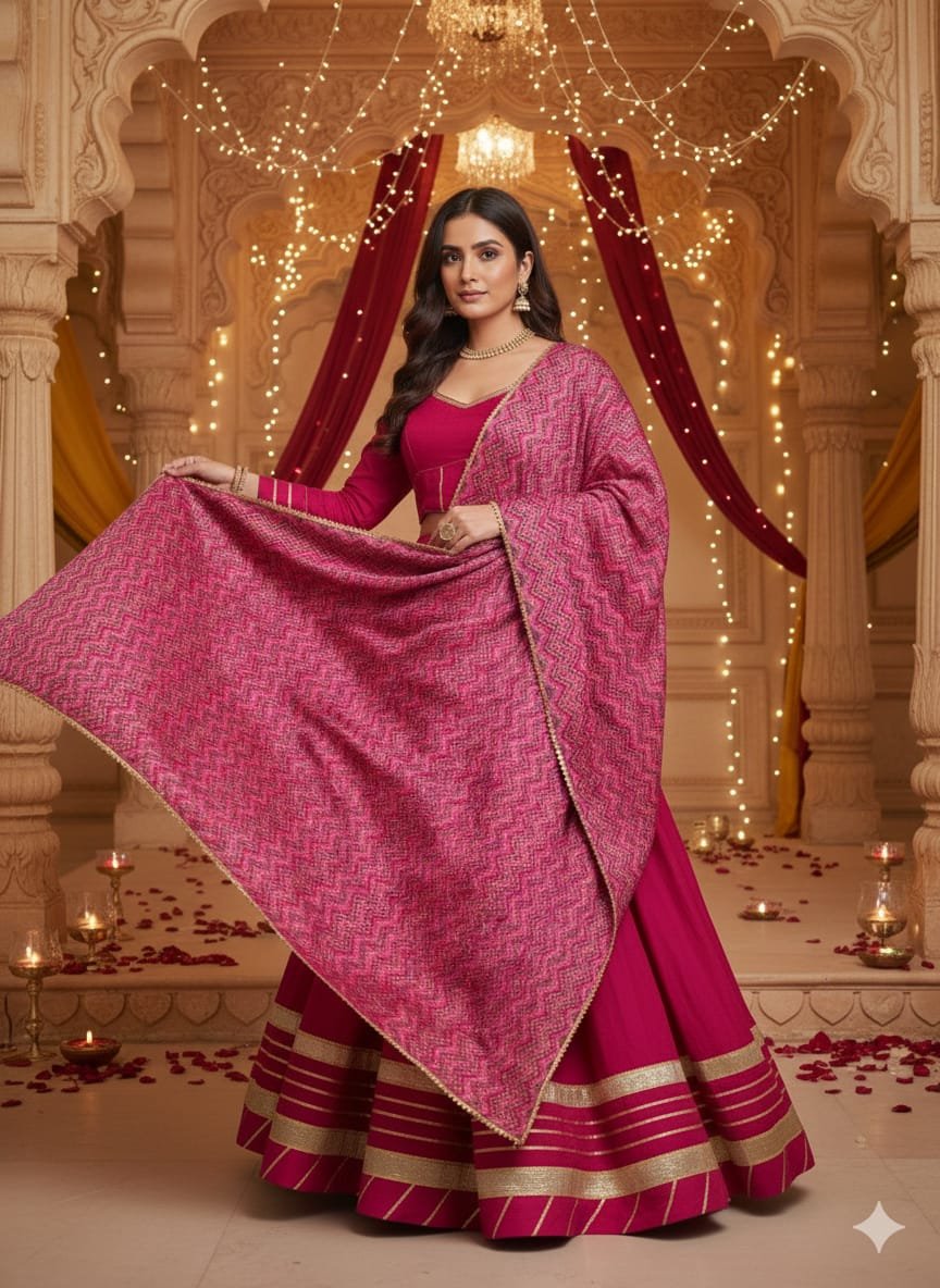 Step into a world of vibrant elegance with our Fuchsia Dream Roman Silk Lehenga & Blouse Set. Crafted from the luxurious Roman Silk, this ensemble offers a stunning drape and rich sheen, perfect for weddings, festive occasions, and grand celebrations. The lehenga features a magnificent flare, beautifully accented with traditional Gota Patti detailing, making it a true showstopper.