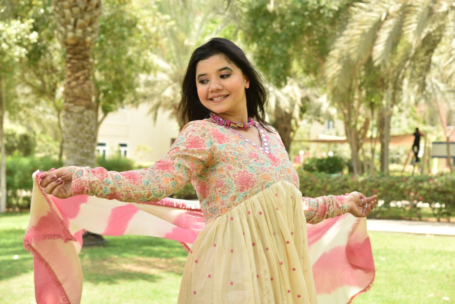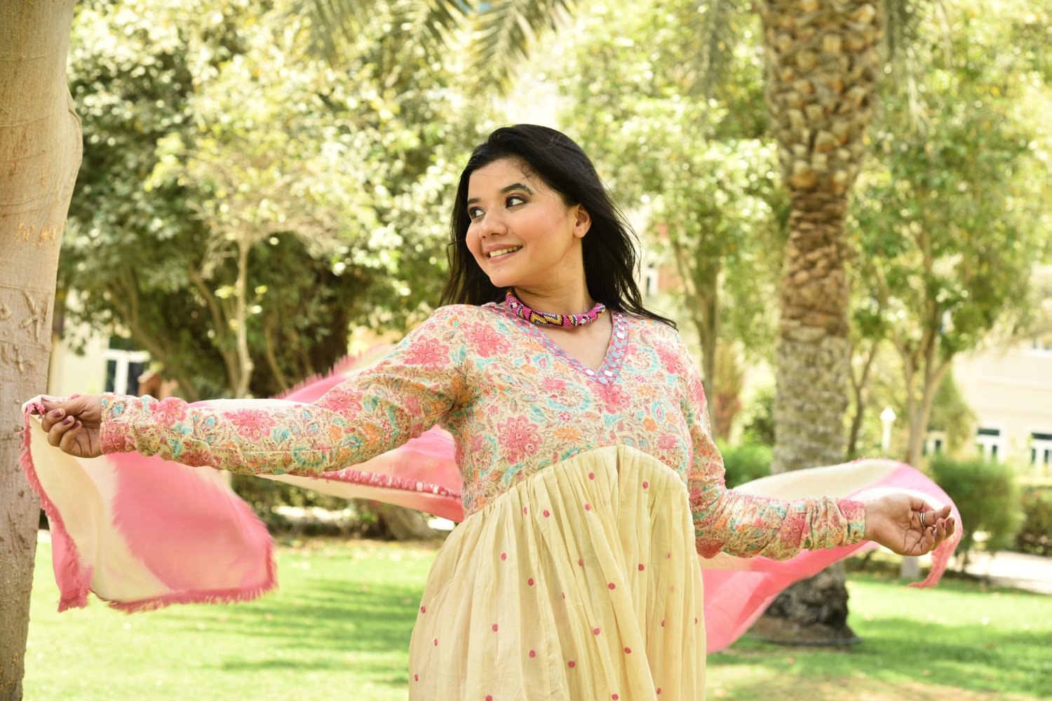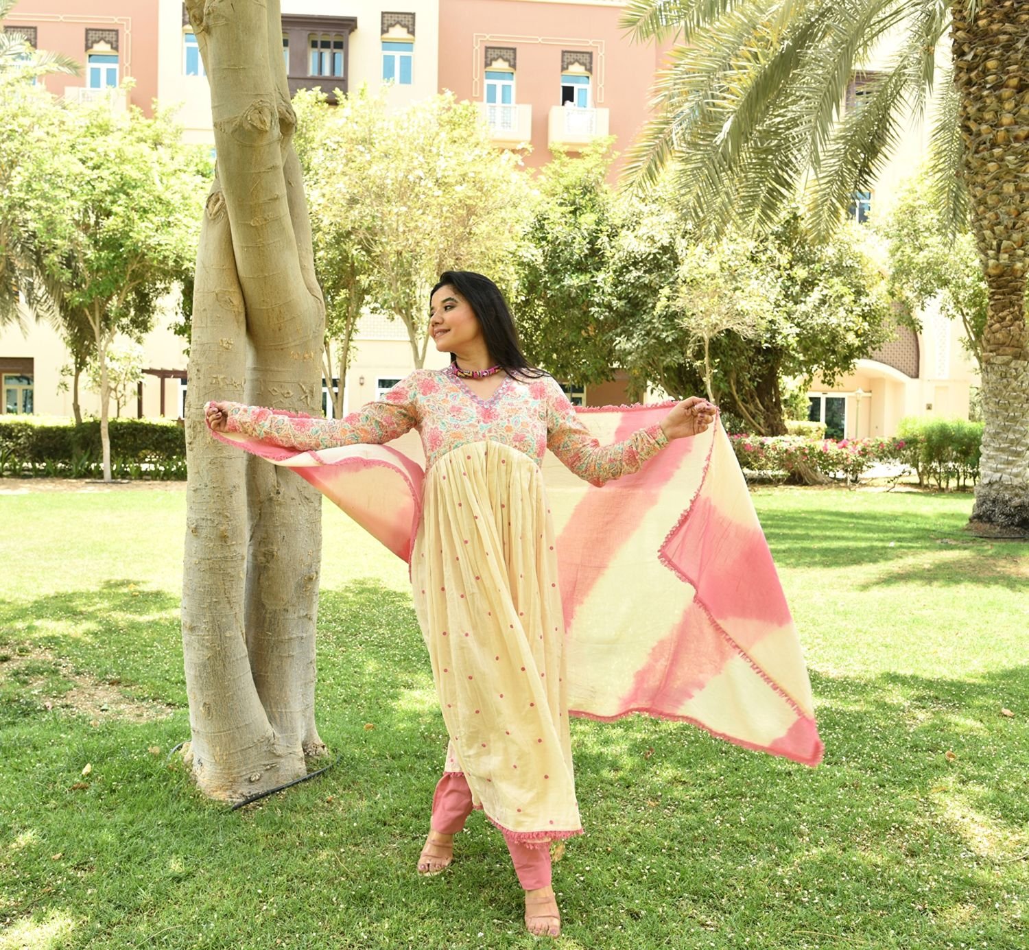 This mulmul cotton floral suit is pink and cream is an soothing and breathable outfit for any summer.