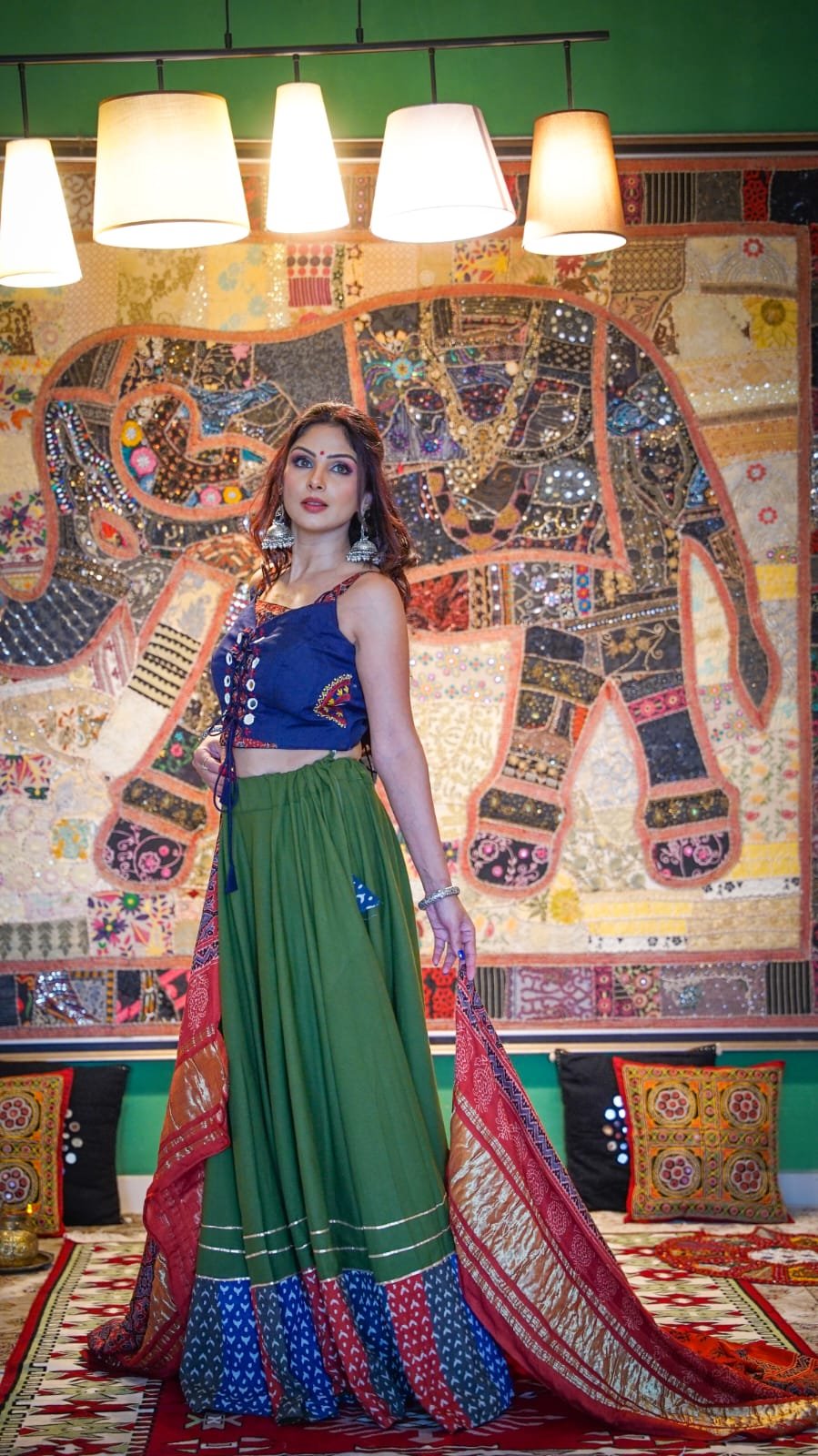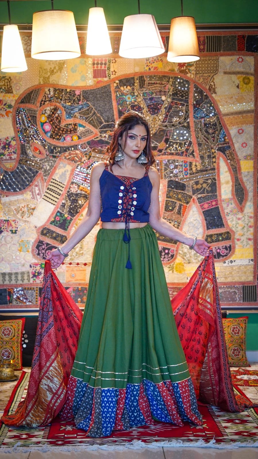 This beautifully crafted flaired skirt is made from pure handblock Ajrakh fabric, celebrating traditional artistry and timeless design. Made using heavy cotton, it offers a structured yet comfortable drape with a rich, voluminous flair. The skirt is accentuated with elegant gota patti detailing, adding a subtle festive shimmer to its earthy charm. Perfect for cultural gatherings, festive occasions, or statement everyday wear, this piece blends heritage craftsmanship with refined elegance.