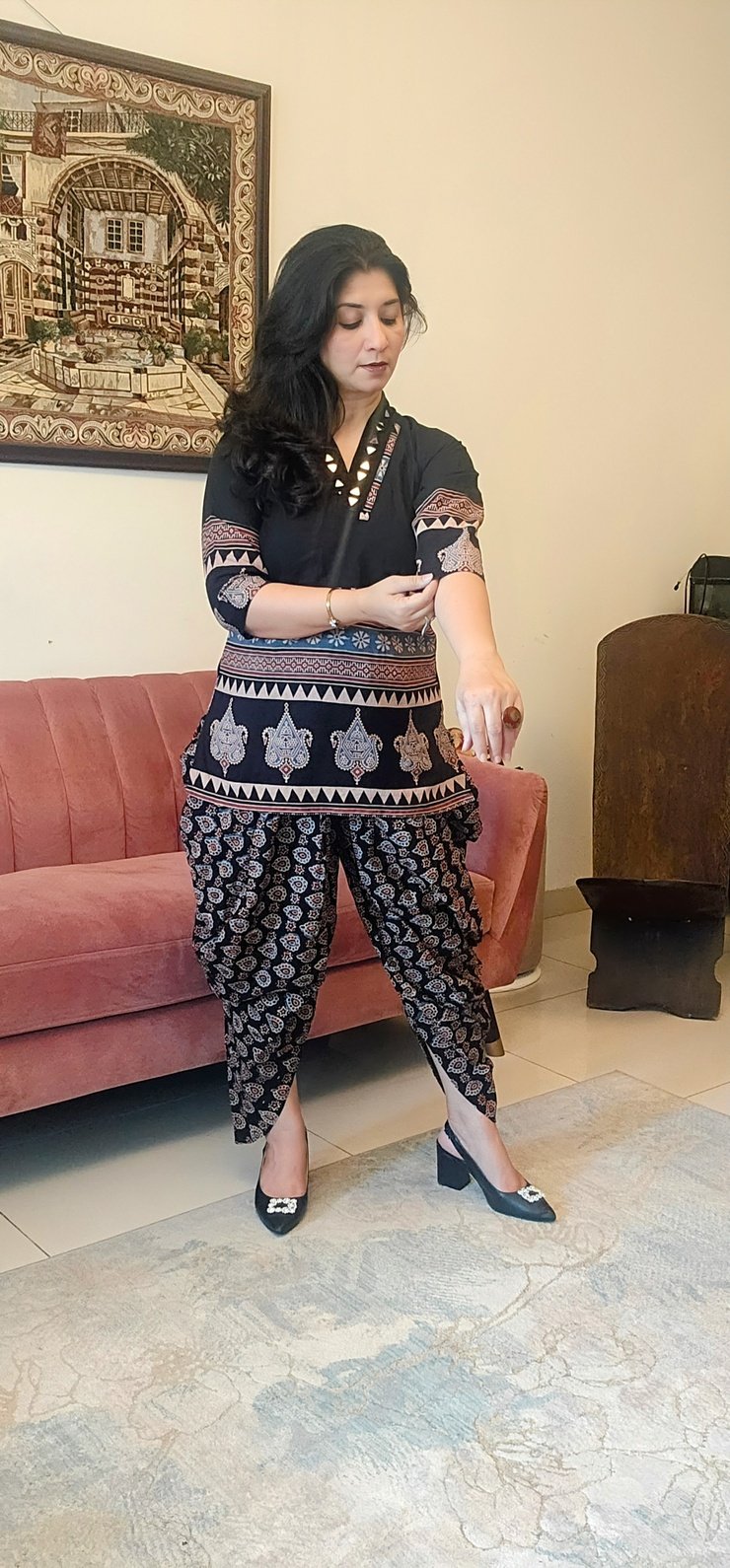 Black V neck cotton top with ajrakh details on neck and sleeves.