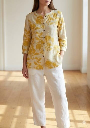 It is a pure cotton and linen blend top with elbow rolled upp sleeves.