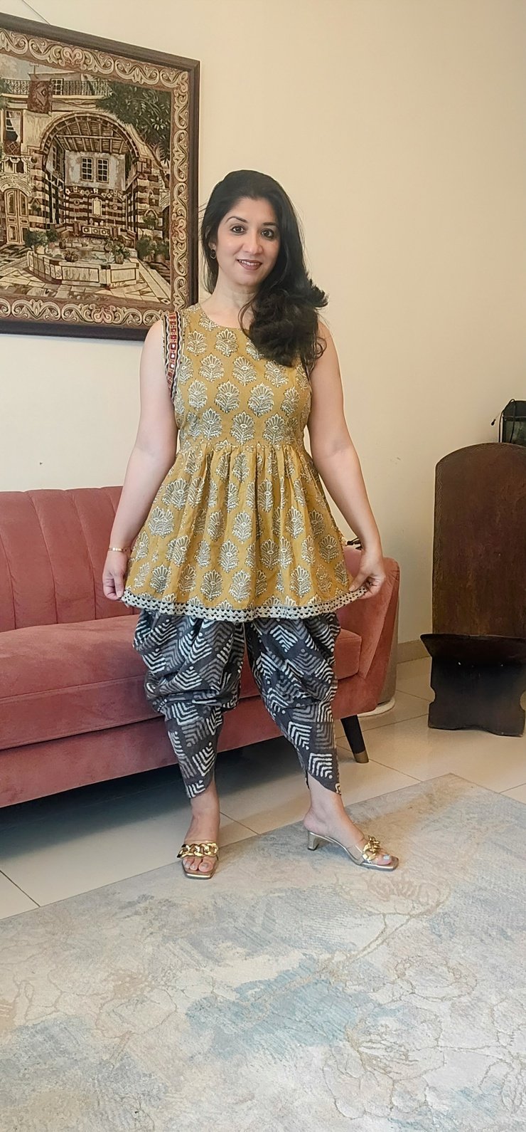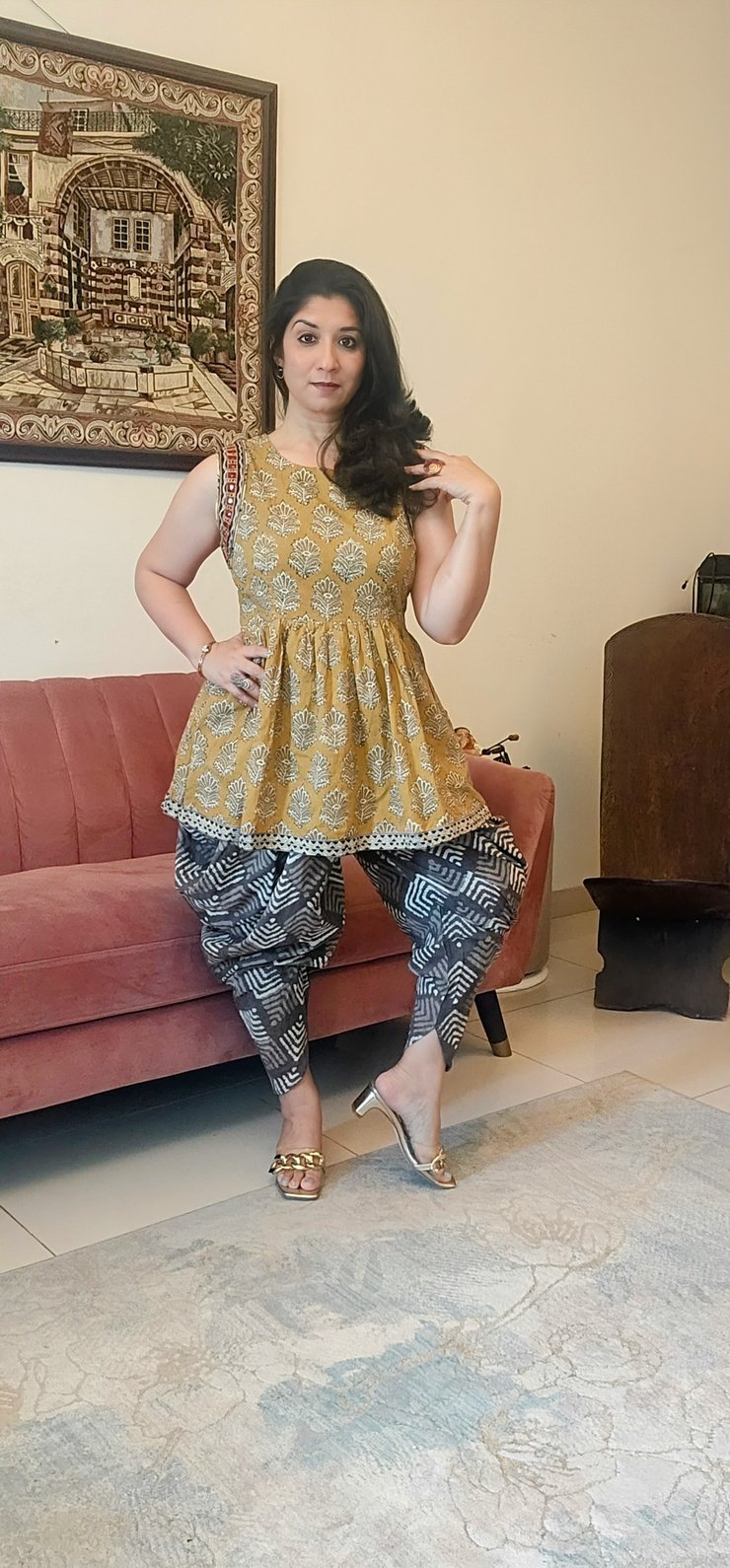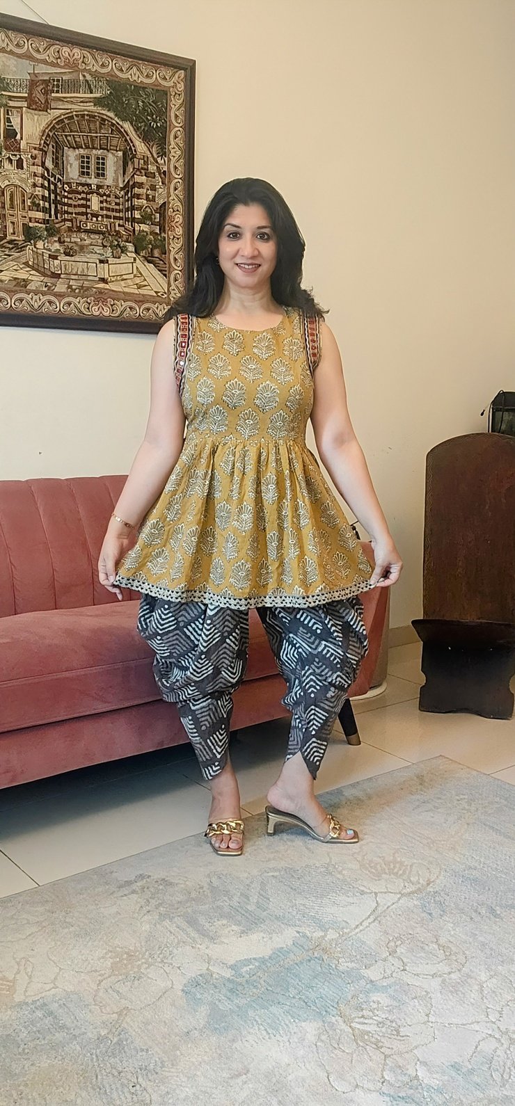 Fusion look is created with the cotton natural dyed dhoti pants.