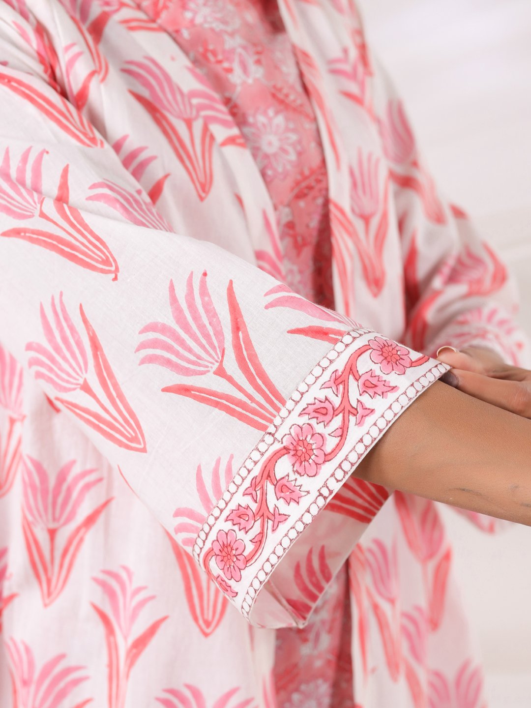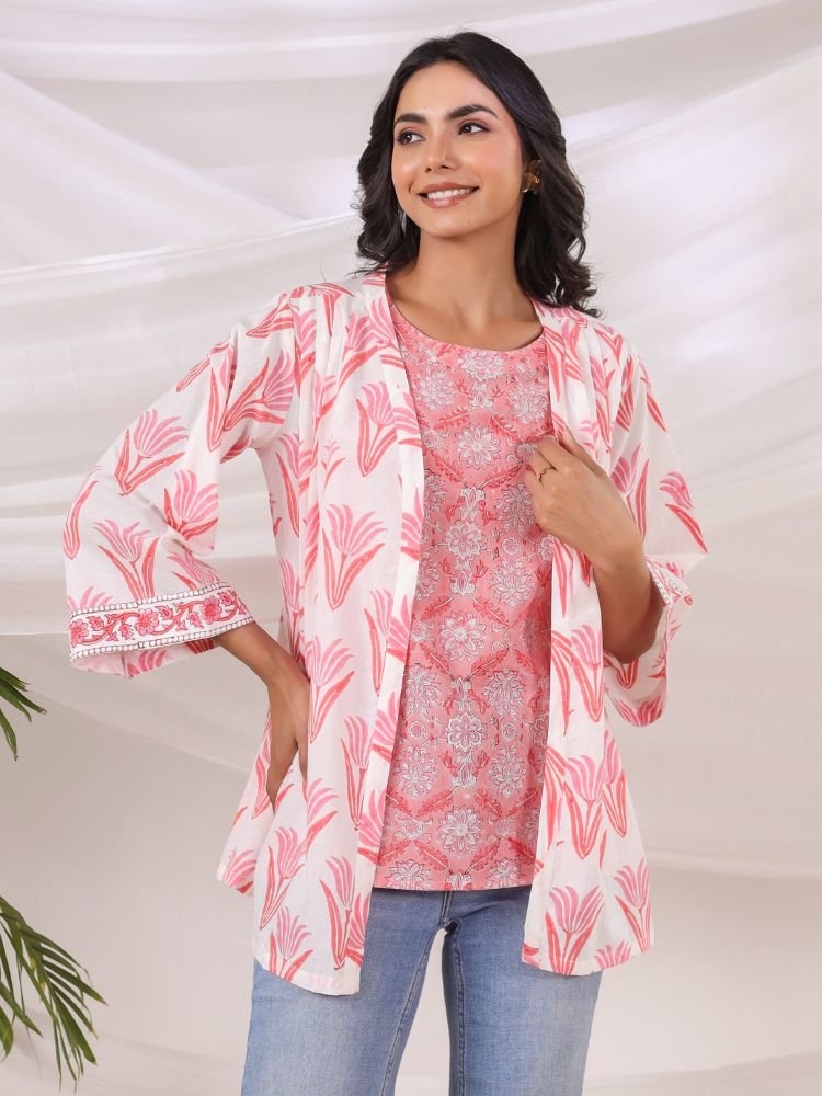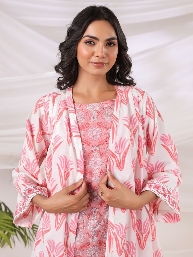 Crafted from breathable cotton, the set showcases delicate Jaipur-inspired floral motifs in soothing pink tones against an ivory base. The inner top offers a flattering fit, while the relaxed overlay coat with wide sleeves adds flow and sophistication. Perfect for transitional weather and all-day wear, this versatile piece blends traditional craftsmanship with modern styling.