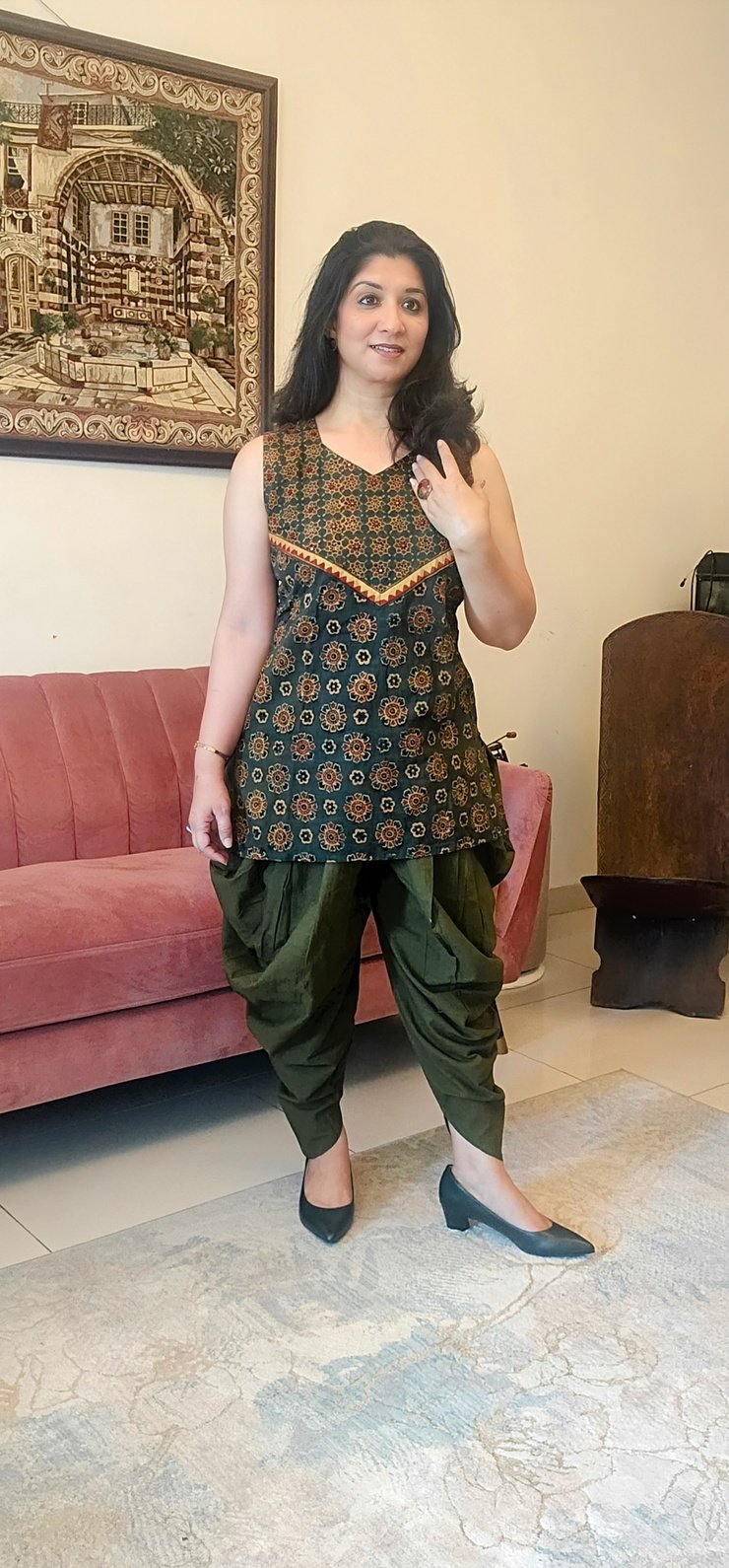 Fusion look is created with the cotton natural dyed dhoti pants.