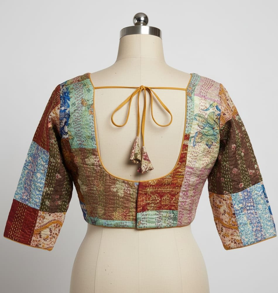 Silk multi patch thread work blouse with elbow sleeves