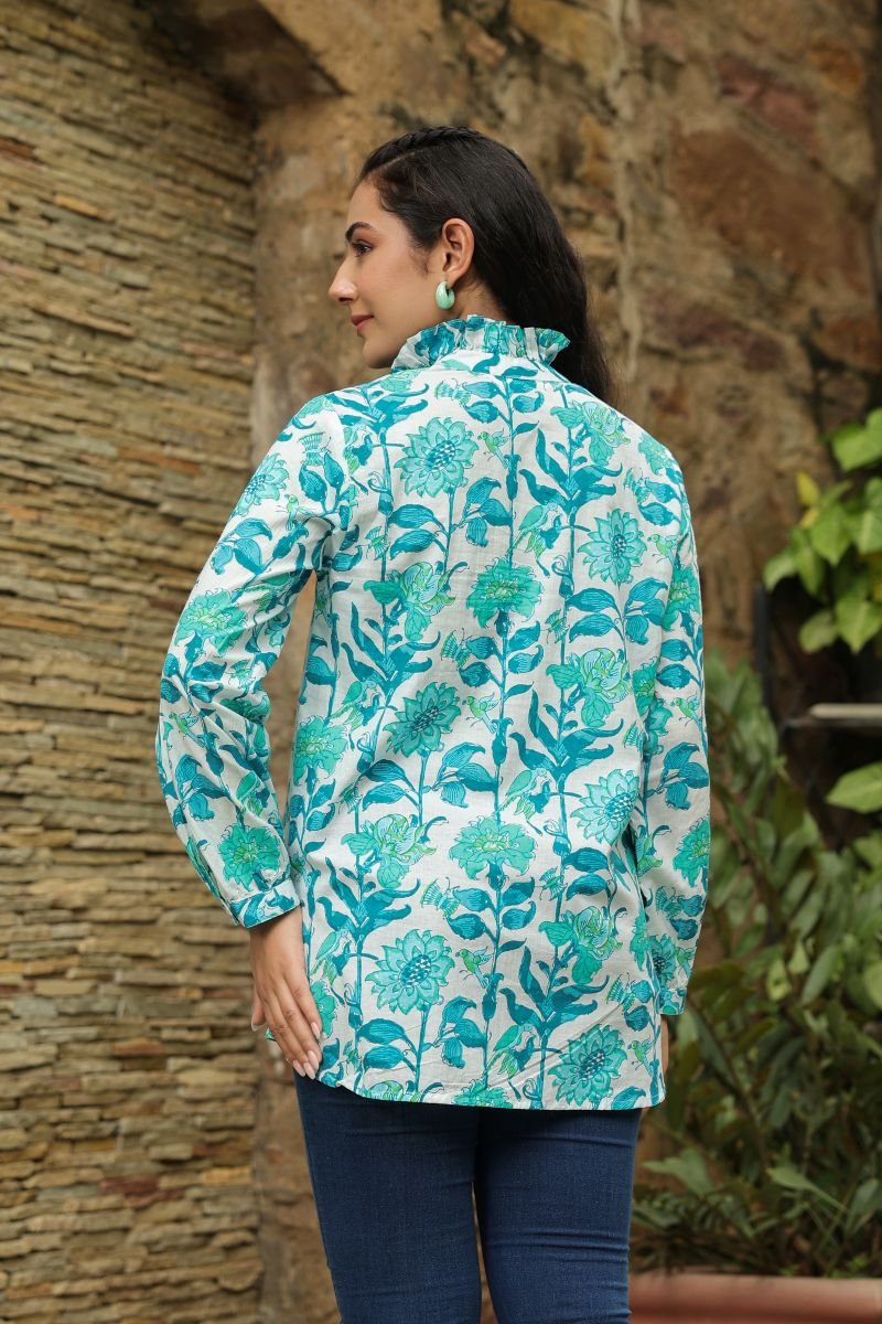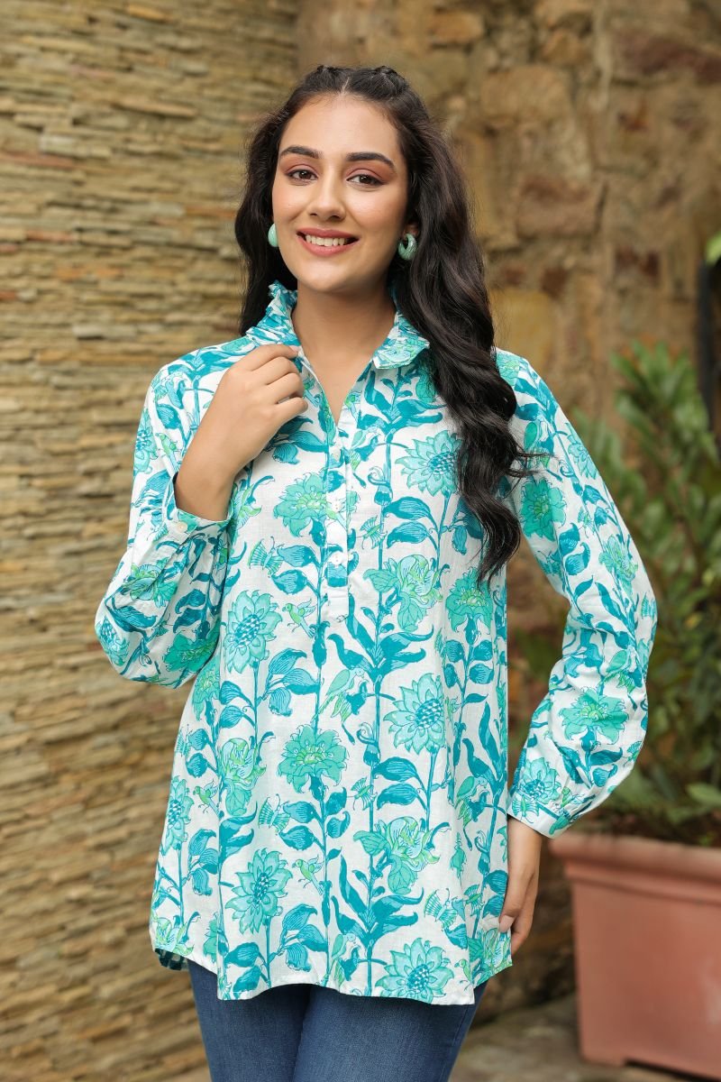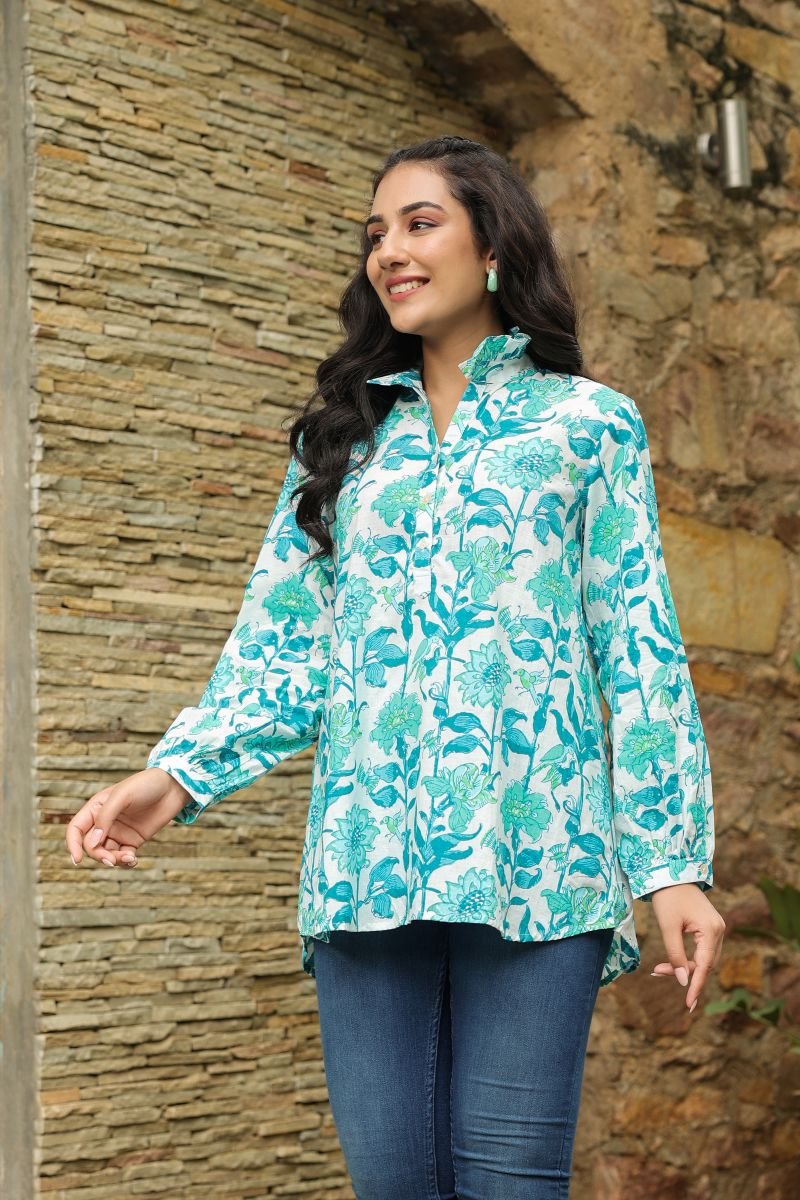 Bring home the charm of Jaipur with this breezy cotton shirt crafted for effortless everyday elegance. Designed in soft, breathable Jaipur cotton, this shirt features a refreshing teal floral print on a soothing base, inspired by traditional handblock artistry.
