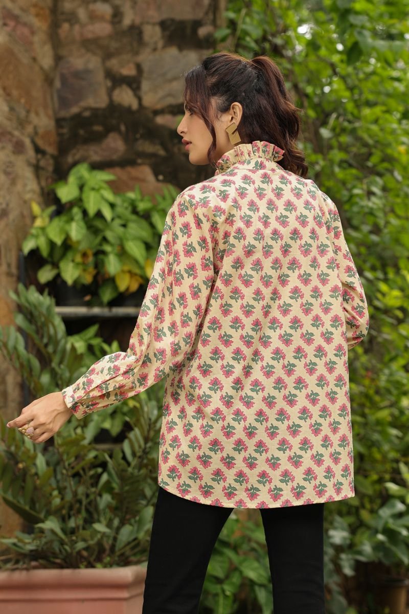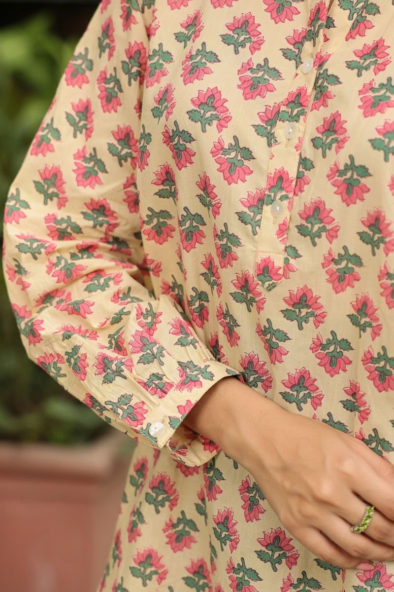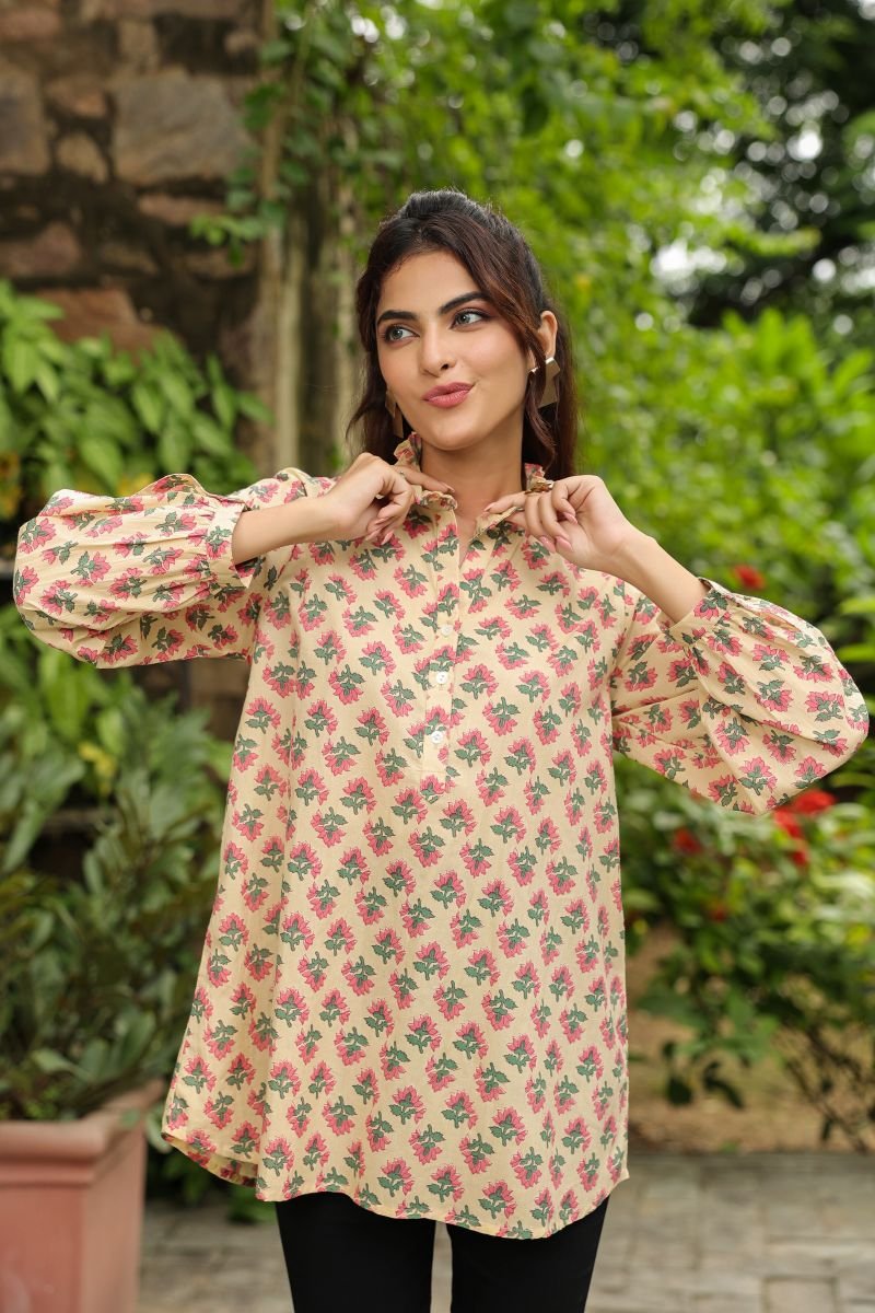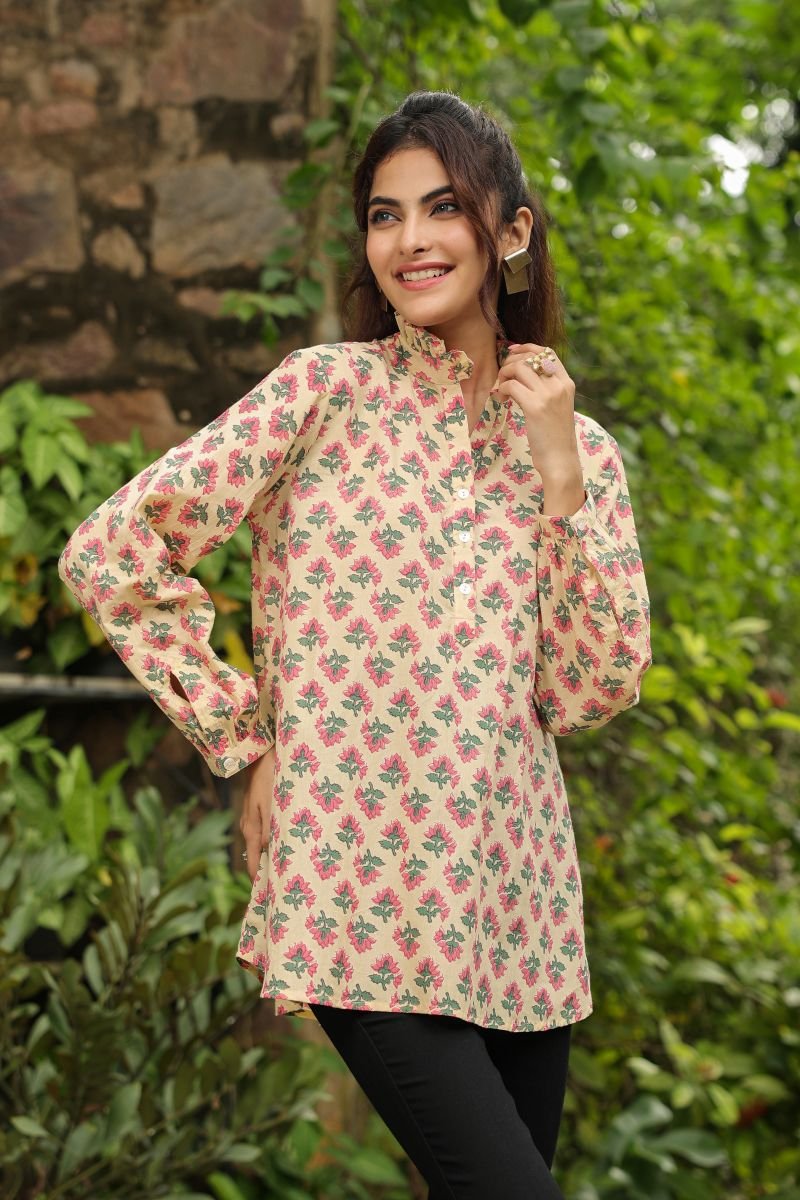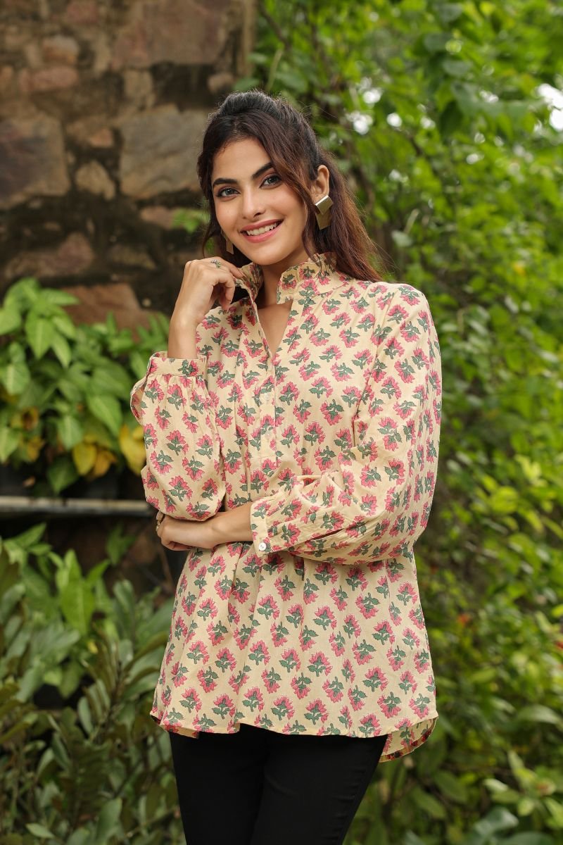 This Jaipur cotton printed top is designed for everyday comfort with a touch of traditional charm. Crafted from soft, lightweight cotton, it features a soothing cream base adorned with delicate pink and green floral motifs inspired by classic handblock artistry.