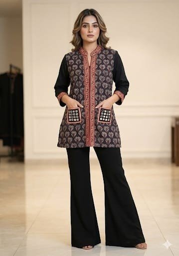 Black cotton vegetable block print formal chinese collar kurta.